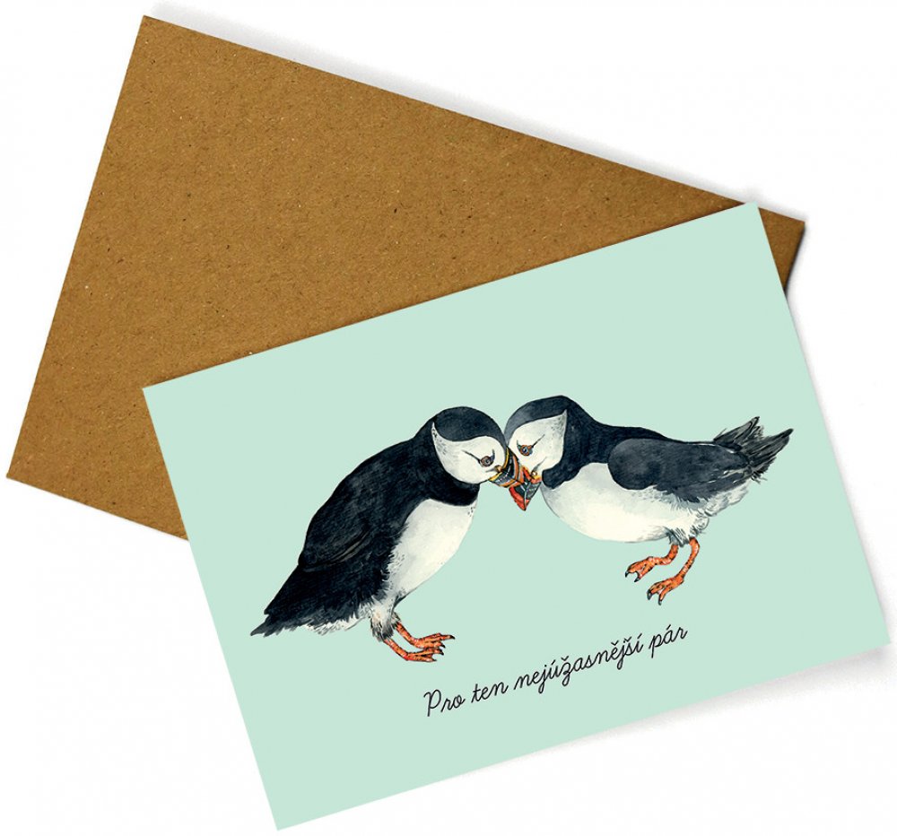 Blahopřání je jednostranné, neotevírací, jedná se o formu pohlednice. Díky tomu lze kartičku jednoduše připevnit na ledničku, vložit do rámečku nebo připíchnout na nástěnku. Z druhé strany je přáníčko čistě bílé, bez textu, na přední straně je ilustrace doplněna textem "Pro ten nejúžasnější pár". Balení obsahuje obálku z recyklovaného papíru.