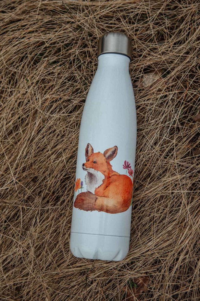 Termoska je potištěná naší autorskou ilustrací lišky, která byla v originále malovaná akvarelem a pastelkami.