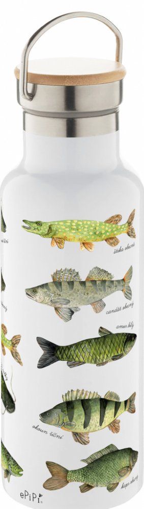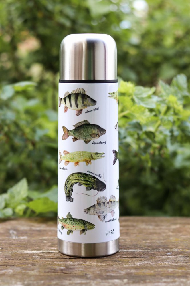 Termoska je potištěná naší autorskou ilustrací sladkovodních ryb, které najdete v českých rybnících a řekách. Na termosku připlavali štika obecná, candát obecný, amur bílý, pstruh obecný (potoční), kapr obecný, sumec velký a okoun říční. Ilustrace byla v originále malovaná akvarelem a pastelkami.
