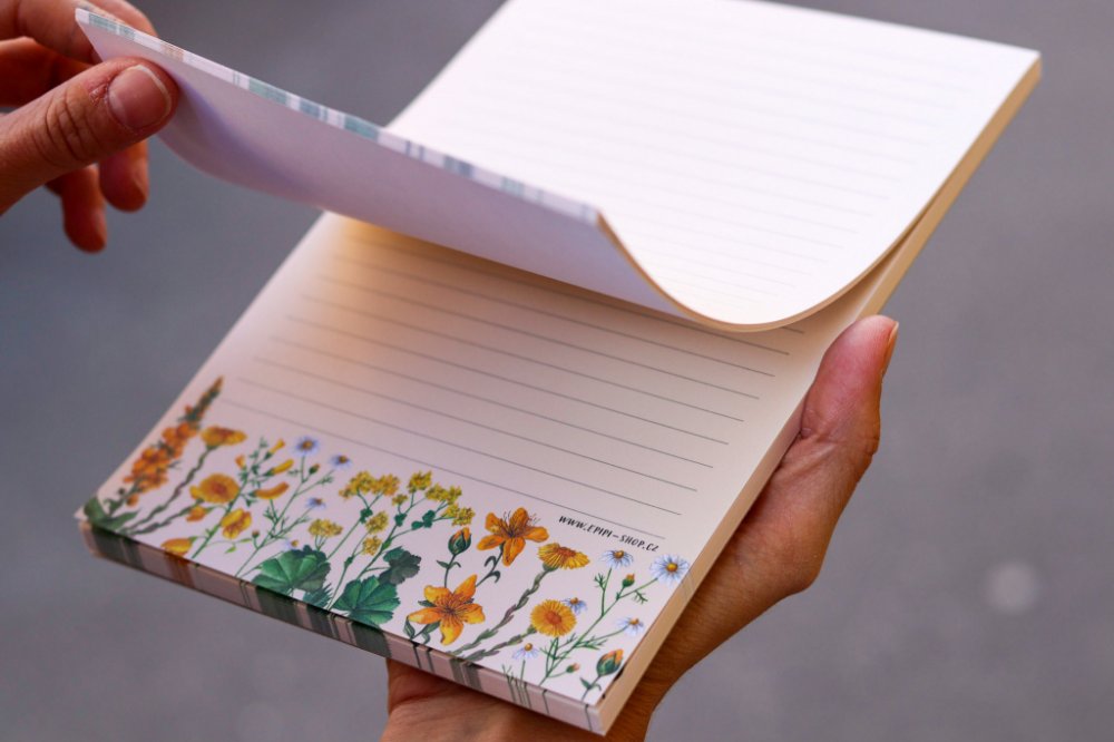 Trhací blok pro rychlé zapsání poznámek, nákupního seznamu nebo vzkazu, který lze využít i jako dopisní papír. Blok je lepený po krátké vrchní straně, takže po vyplnění můžete list z archu vytrhnout a přišpendlit si ho na nástěnku nebo třeba na ledničku, ať jej máte stále na očích. Listy jsou potištěny autorskými ilustracemi, spodní okraj bloku lemují bylinky na krémově žlutém podkladu.