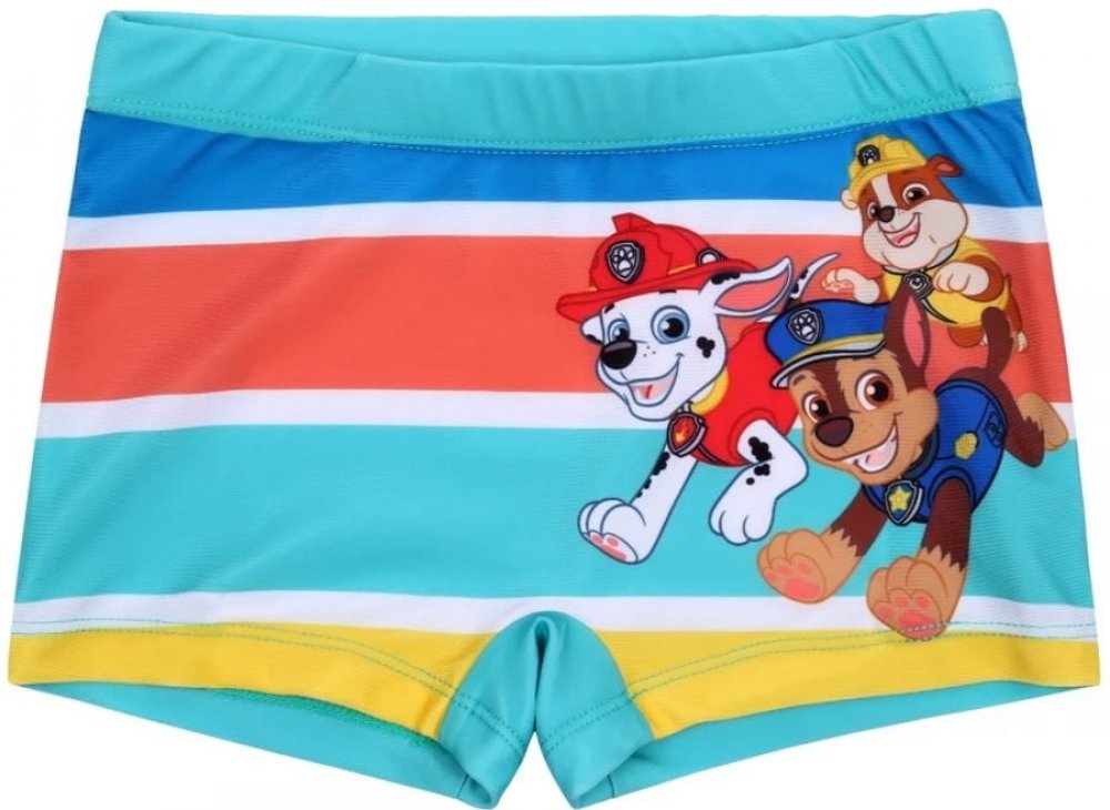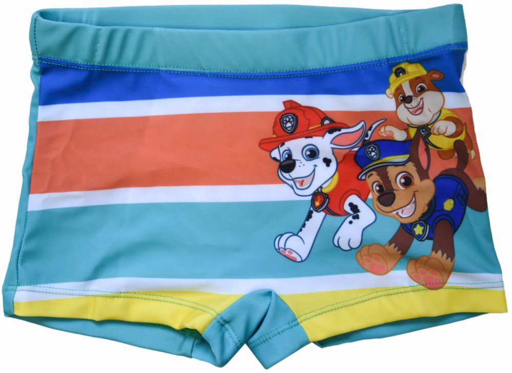 Dětské plavky boxerky pro kluky Tlapková patrola - Paw Patrol. Přední stranu plavek zdobí obrázek záchranářů Chase, Marshalla a Ruble na pruhovaném podkladu. Na přední části je z vnitřní strany jemná bílá podšívka. Materiál plavek je elastický, takže se dobře přizpůsobí tělu a pohodlně se nosí. Zadní strana plavek a široká guma v pase je tyrkysová, nebo tmavě modrá - viz výběr barvy a velikosti.