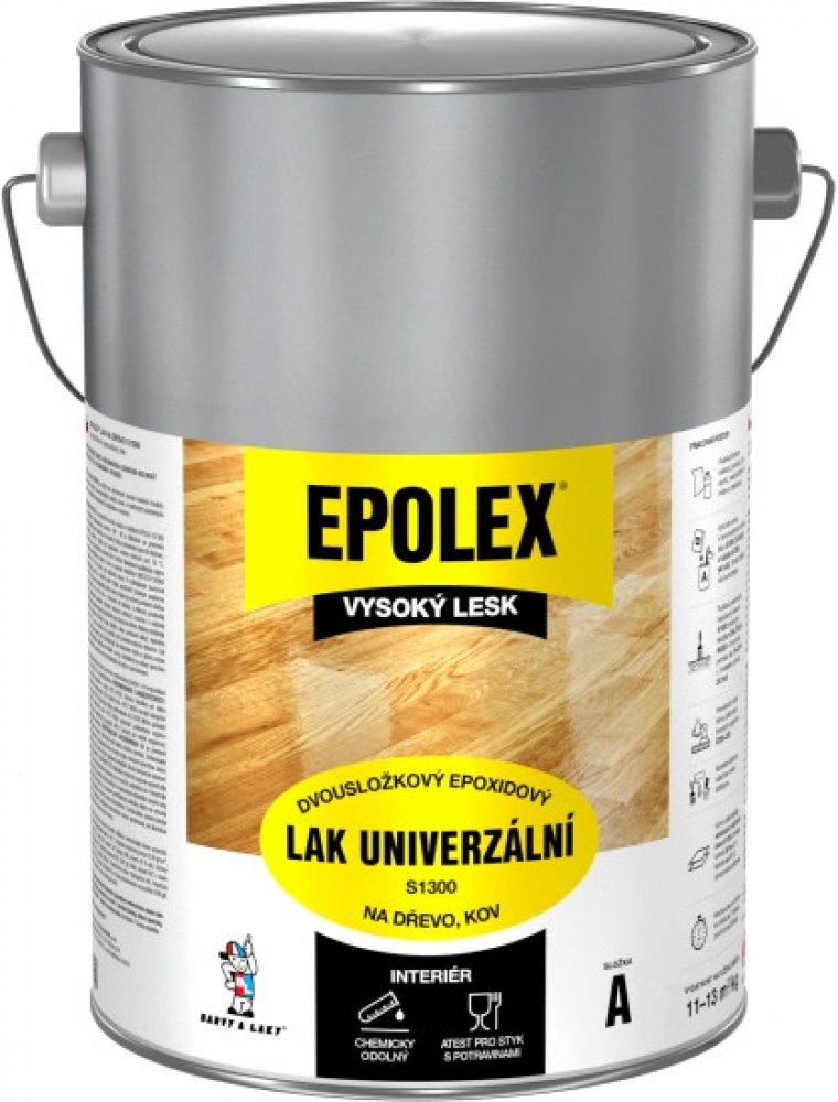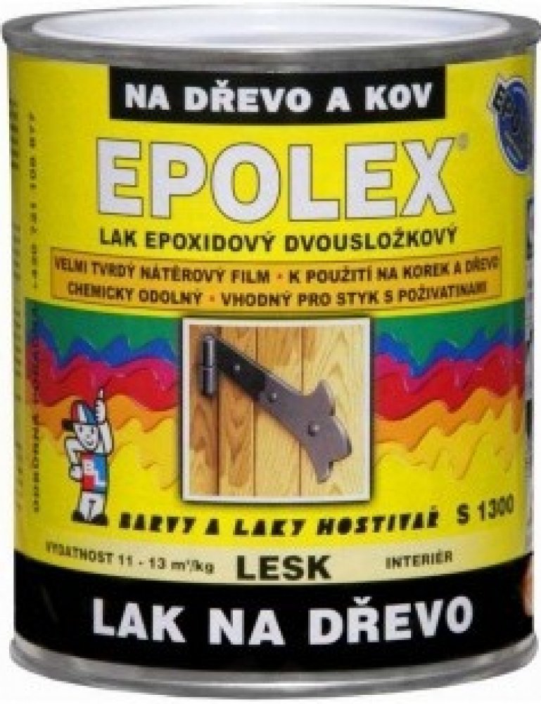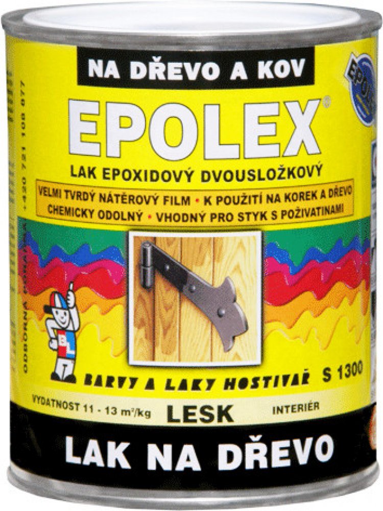 Transparentní nátěr dřeva 1. 1x lak epoxidový S 1300 EPOLEX LAK NA DŘEVO přiředěný ředidlem na výtokovou dobu z pohárku 15-25 s, zasychání 24 hodiny při pokojové teplotě; 2. lehké přebroušení brusným papírem č. 280-320 a odstranění obrusu; 3. 1x lak epoxidový S 1300 EPOLEX LAK NA DŘEVO, zasychání 24 hodiny; 4. přebroušení brusným papírem č. 320 a odstranění obrusu; 5. 1x lak epoxidový S 1300 EPOLEX LAK NA DŘEVO. Zasychání a vytvrzení nátěru je možno (pokud to natřený podklad umožňuje) urychlit přisoušením při zvýšené teplotě, např. při 60°C - 60 minut, při 80°C - 45 minut, při 100°C - 30 minut. Nátěr je možno brousit a leštit brusnou pastou a polišem.