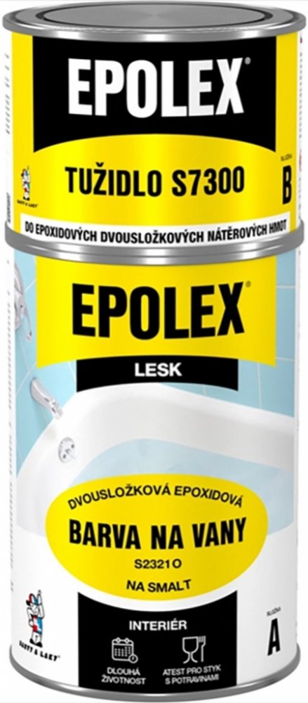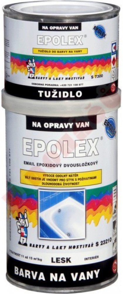 Email epoxidový dvousložkový, určený pro renovaci povrchu smaltovaných van, vaniček sprchových koutů. Není vhodný na akrylátové povrchy. Email epoxidový dvousložkový, určený pro renovaci povrchu smaltovaných van, vaniček sprchových koutů. Není vhodný na akrylátové povrchy. Pracovní postup: Vanu důkladně umyjeme účinným prostředkem na odstranění mastnoty a vodního kamene, usazenin. Pro dobrou přilnavost povrch důkladně zdrsníme brusným papírem č. 280 - 320 za mokra. Opláchneme vodou a necháme uschnout. Poškozená místa (odprýsknutý smalt apod.) zatmelíme epoxidovým tmelem na kov. Po vytvrdnutí přebrousíme brusným papírem pod vodou č. 320 - 360. Povrch umyjeme roztokem saponátu. Odmontujeme šroubení (odpad a přepad ), odkryté plochy důkladně přebrousíme a očistíme. Zamezíme odkapávání vody. Povrch by měl být matný, suchý a naprosto čistý. Oblepíme vanu zakrývací páskou. Teplota podkladu musí být min. 15 °C. Proudění vzduchu (průvan) může způsobit zaprášení a jiné defekty vzhledu. Email natužíme tužidlem v předepsaném poměru, důkladně promícháme a ponecháme asi 15 minut odpěnit. Natíráme do kříže v rovnoměrné tenčí vrstvě. Druhý nátěr zhotovíme s odstupem 24 hodin. Nevhodné pro venkovní použití Doporučené způsoby aplikace: Stříkání, štětec, váleček Vydatnost: 11 - 15 m²/1 kg natužené směsi na jednu vrstvu 30 - 40 µm Bezpečnostní upozornění GHS02 - hořlavé látky GHS05 - korozivní a žíravé látky GHS07 - dráždivé látky GHS08 - látky nebezpečné pro zdraví GHS09 - látky nebezpečné pro životní prostředí Signální slovo: Nebezpečí Obsah nebezpečných látek Xylen (směs), butan-1-ol , Uhlovodíky, C9, aromatické , Epoxidová pryskyřice z Bisfenolu A a epichlorhydrinu. EUH205 Obsahuje epoxidové složky. Může vyvolat alergickou reakci. H226 Hořlavá kapalina a páry. H312+H332 Zdraví škodlivý při styku s kůží nebo při vdechování. H315 Dráždí kůži. H317 Může vyvolat alergickou kožní reakci. H318 Způsobuje vážné poškození očí. H335 Může způsobit podráždění dýchacích cest. H373 Může způsobit poškození orgánů při prodloužené nebo opakované expozici. H411 Toxický pro vodní organismy, s dlouhodobými účinky. P102 Uchovávejte mimo dosah dětí. P210 Chraňte před teplem, horkými povrchy, jiskrami, otevřeným ohněm a jinými zdroji zapálení. Zákaz kouření. P261 Zamezte vdechování prachu/dýmu/plynu/mlhy/par/aerosolů. P273 Zabraňte uvolnění do životního prostředí. P280 Používejte ochranné rukavice/ochranný oděv/ochranné brýle/obličejový štít. P304+P340 PŘI VDECHNUTÍ: Přeneste