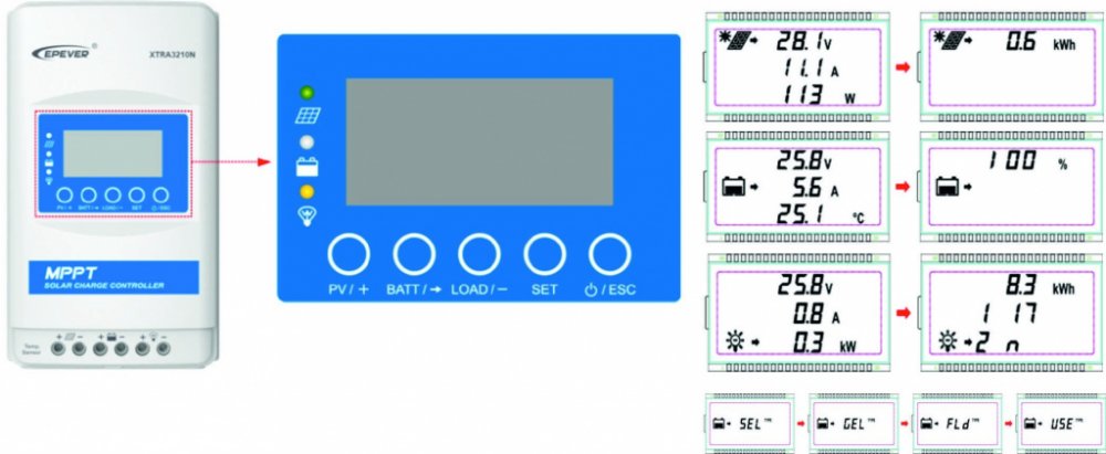 Nastavení parametrů regulátoru (hlavně se jedná o typ používané baterie) se provádí pomocí vestavěného LCD, nebo externího displeje MT50 - není součástí regulátoru
