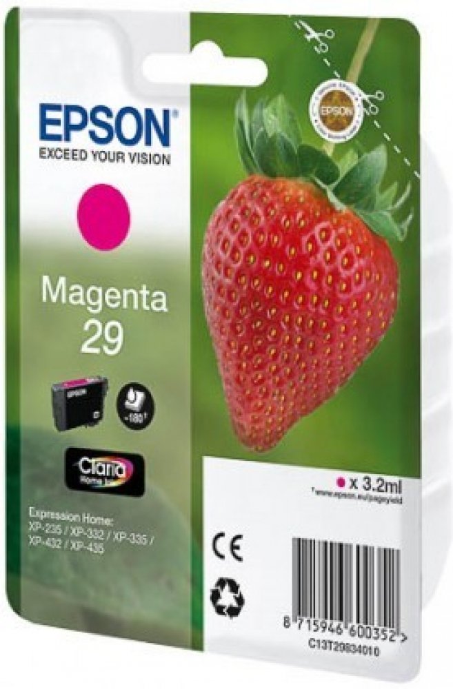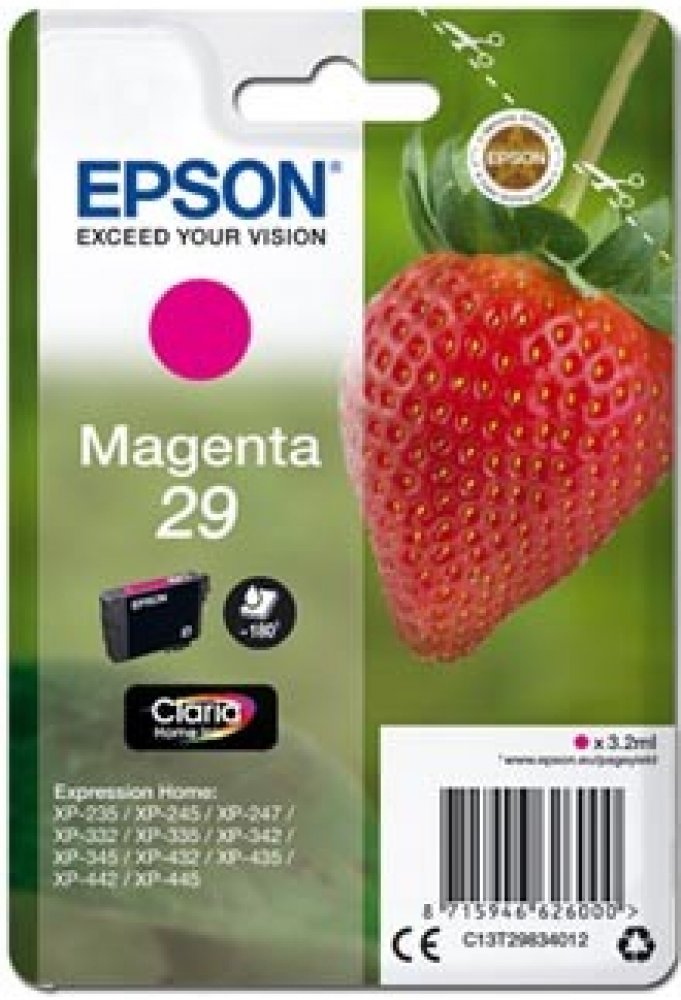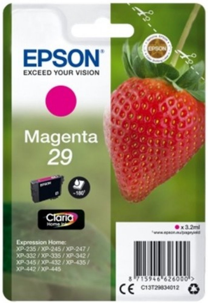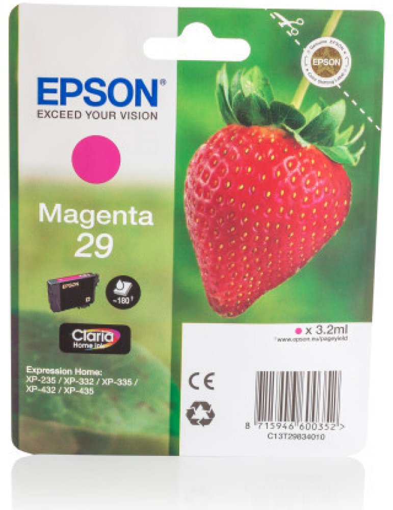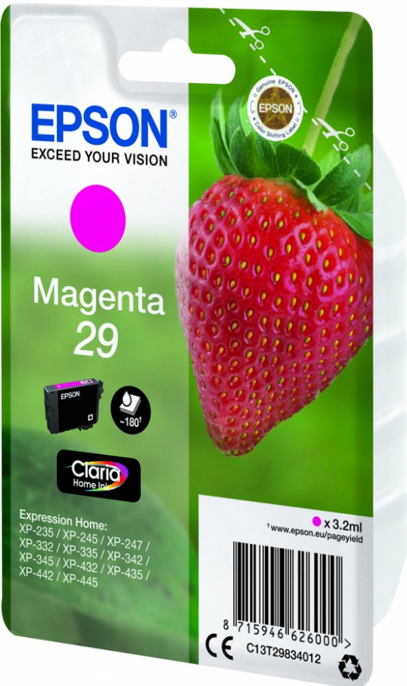 Spolehlivý a kvalitní tisk textových dokumentů zajistí cartridge Epson. Zajistěte si dokonalý dojem a excelentní výsledky na různých typech papírů určených pro inkoustové tiskárny. Náplň kazety postačuje na 180 stran. Náplň byla testována dle platných norem a její výtěžnost odpovídá 5% pokrytí strany A4. Jde o originální náplň do tiskárny, která zajišťuje skvělé výsledky a spolehlivý výkon. Cartridge je skvělou volbou pro vysokou rychlost a kvalitu tisku. K tomu je nejlepší volbou pro tisk fotografií, díky přirozeným barvám a plynulým přechodům. V balení se nachází jednobarevná náplň. Barva inkoustu je purpurová. Hlavní přednosti cartridge Epson T2983 purpurová Cartridge Epson zajistí tisk textových dokumentů Výtěžnost při 5% pokrytí strany činí 180 stran Originální cartridge do tiskárny poskytuje trvale spolehlivý výkon Součástí balení je jednobarevná náplň Barva inkoustu náplně do tiskárny je purpurová Pro tiskárny značky: Epson Expression Model tiskárny: XP-235, XP-332, XP-335, XP-432 a XP-435
