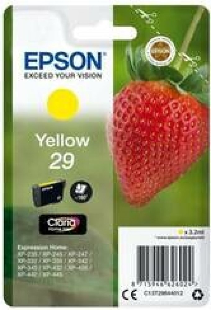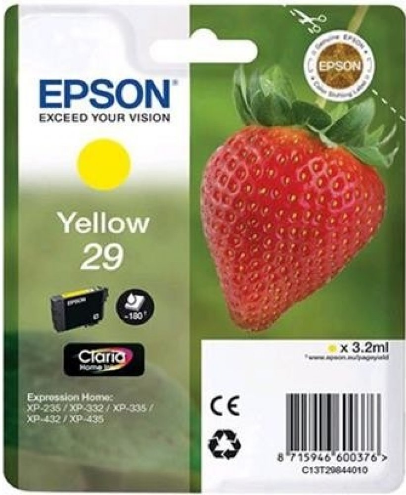 Žlutá originální inkoustová cartridge Epson C13T29844010 určená pro dosažení kvalitního tisku a životnosti tiskárny. Určeno pro tiskárny: Epson Expression Home XP-330, Epson Expression Home XP-332. Barva: žlutá, Kapacita: 3,2ml stran při 5% pokrytí, OEM: C13T29844010