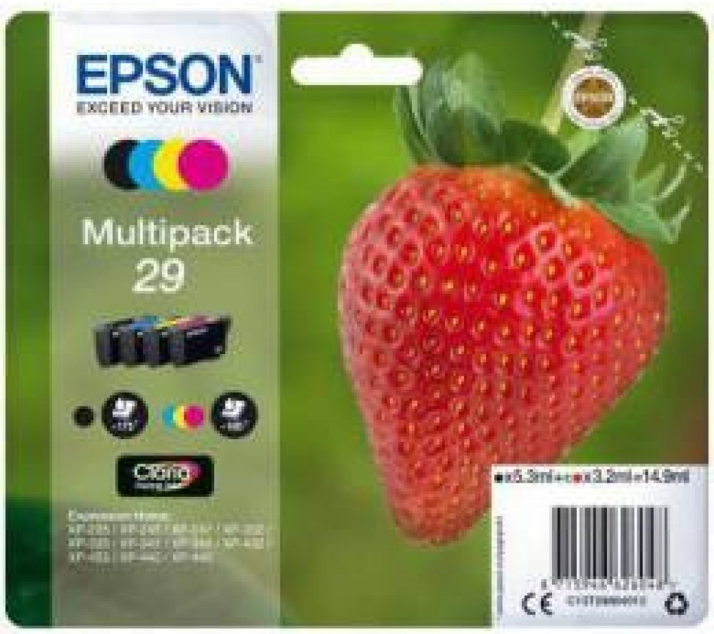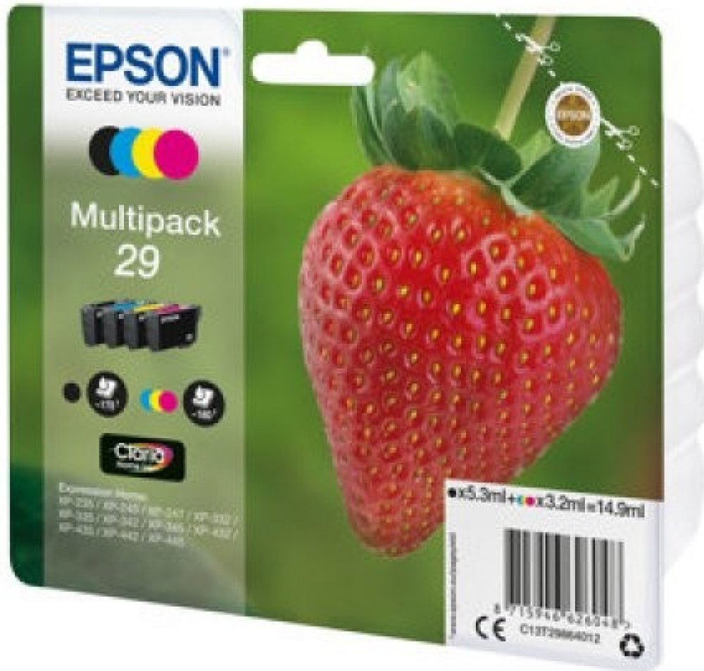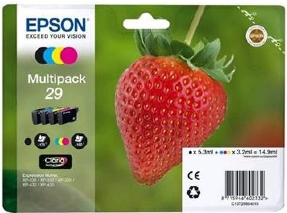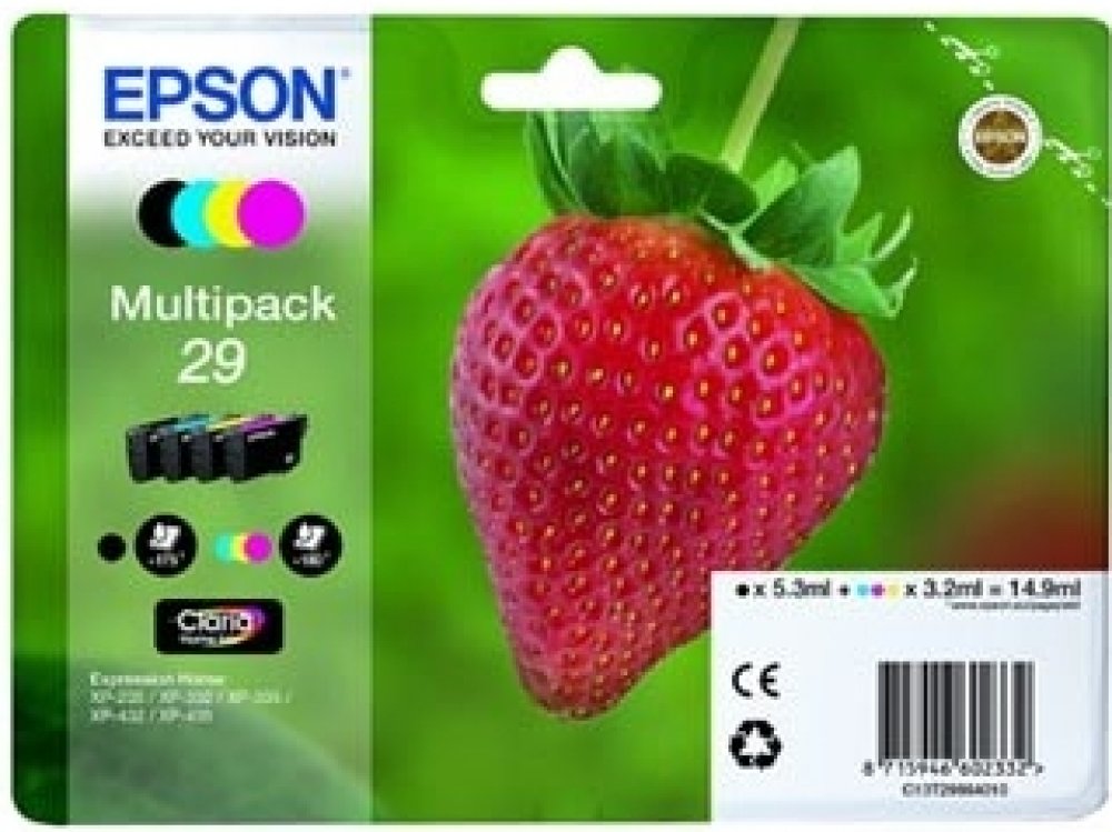 Sada černá, modrá, červená a žlutá originální inkoustová cartridge Epson C13T29864010 určená pro dosažení kvalitního tisku a životnosti tiskárny. Určeno pro tiskárny: Epson Expression Home XP-330, Epson Expression Home XP-332. Barva: Sada černá, modrá, červená a žlutá, Kapacita: 5,3ml +3 x 3,2ml stran při 5% pokrytí, OEM: C13T29864010