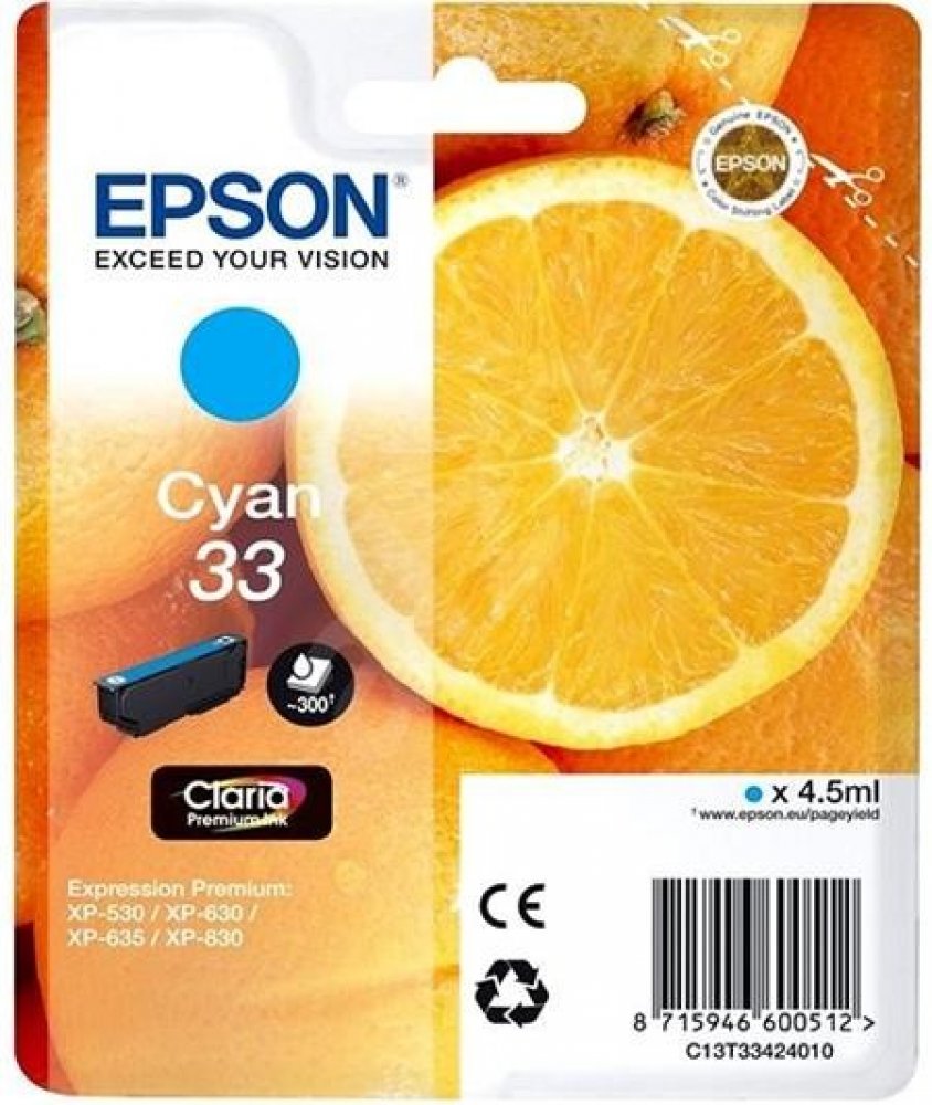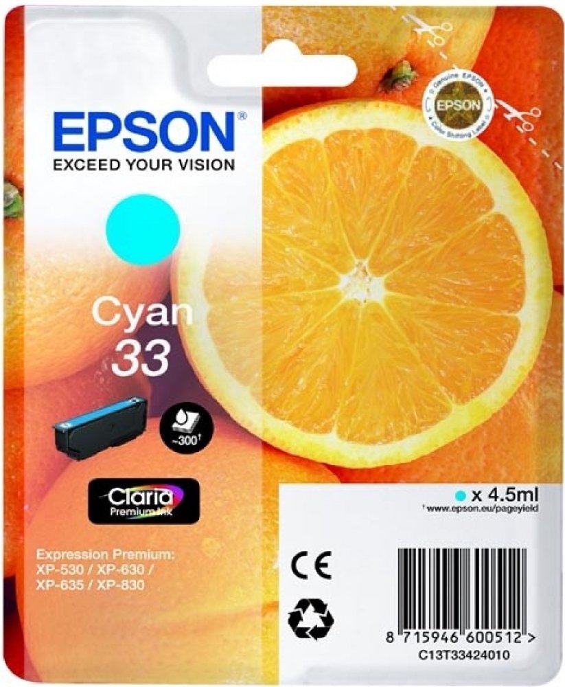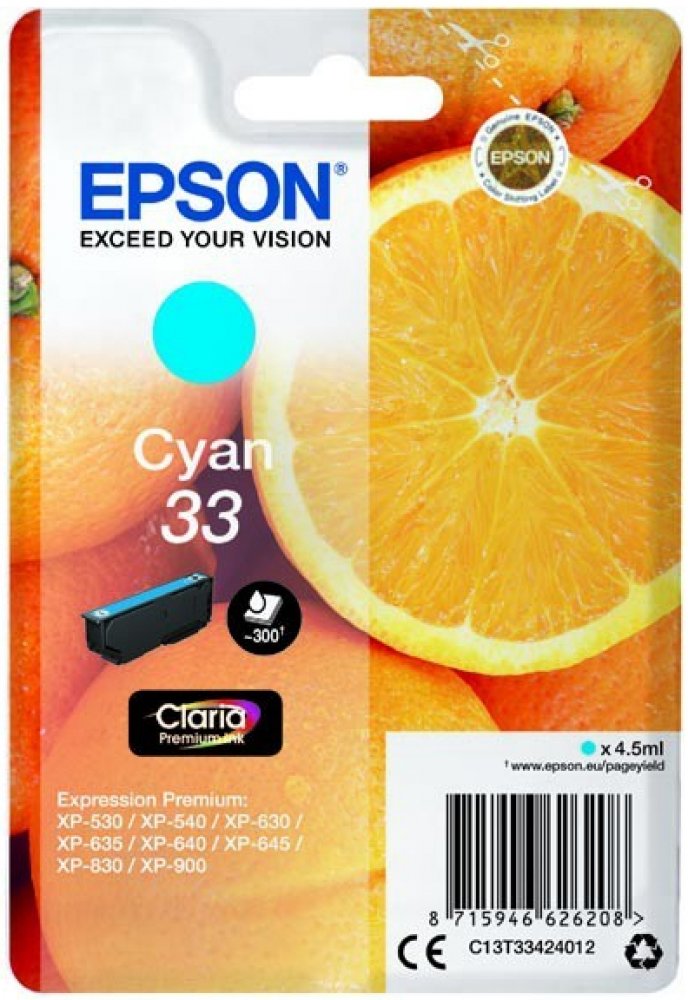 Originální Inkoust Epson T3342 (C13T33424010, T33). Kompatibilní tiskárny: Epson Expression Premium XP-630, Epson Expression Home XP-530, Epson Expression Premium XP-530, Epson Expression Home XP-830, Epson Expression Premium XP-635, Epson Expression Home XP-635, Epson Expression Premium XP-900, Epson Expression Premium XP-830, Epson Expression Home XP-630. Barva náplně: azurová.