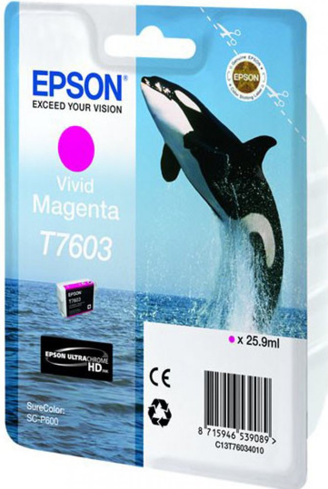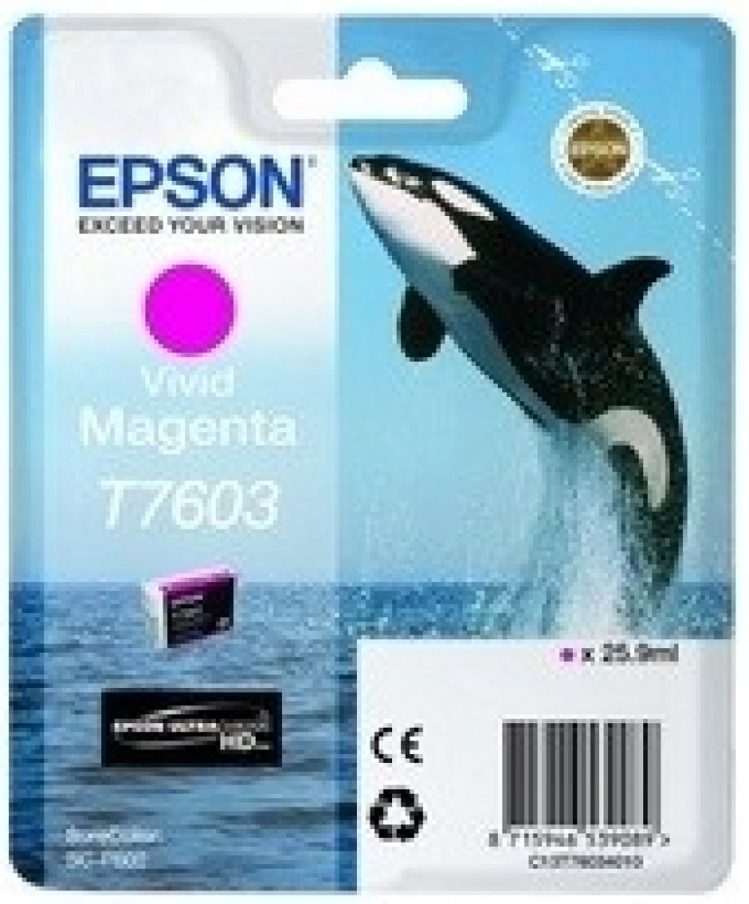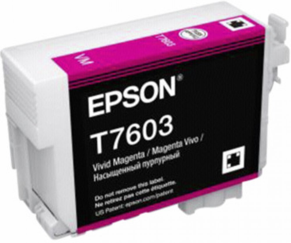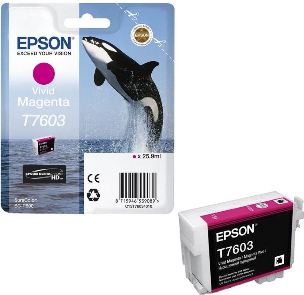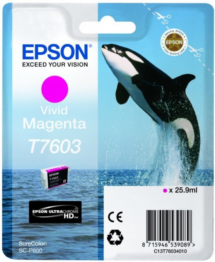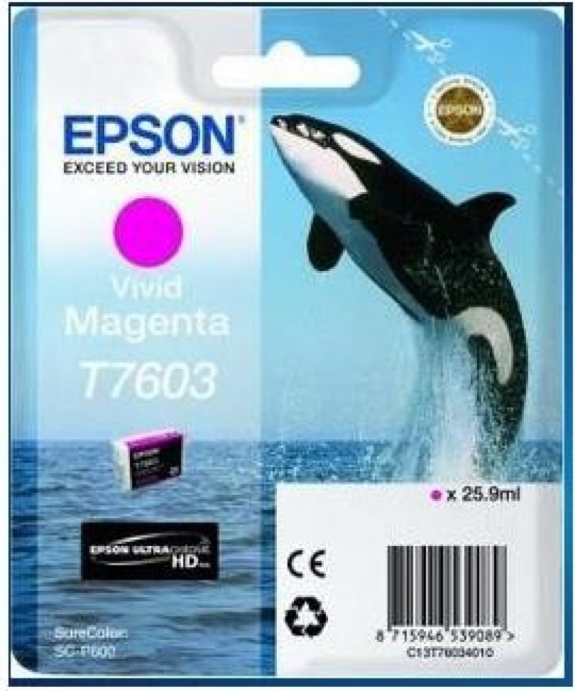 Balení obsahuje:1x Epson T7603, originální tisková náplň Vivid Magenta 25,9mlPopis: Každý výrobce doporučuje svým zákazníkům používání originálních tiskových kazet. Důvodem je především zaručená kvalita tisku. U alternativních výrobků ( kompatibilních i renovovaných kazet ) dochází totiž mnohem častěji k vadám na kvalitě tisku, což je dáno horší kvalitou samotného inkoustu. Dalším velkým problém...