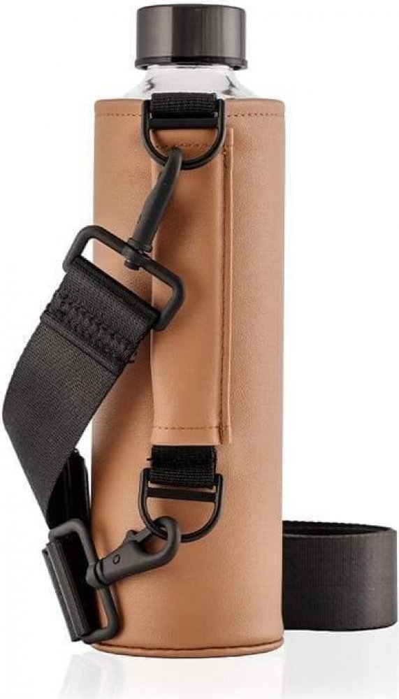 Ekologická skleněná lahev EQUA z odolného a lehkého skla s minimalistickým designem s obalem s umělé kůže přes rameno. Má elegantní minimalistický design a je perfektním řešením pro dlouhé procházky se psem, túry nebo pochůzky po městě. Ať ji budete nosit na rameni nebo křížem přes tělo, podtrhne váš nadčasový streetový styl.