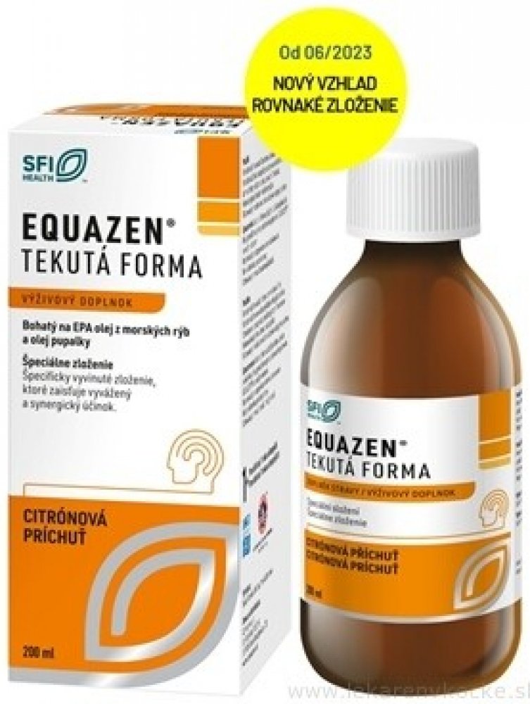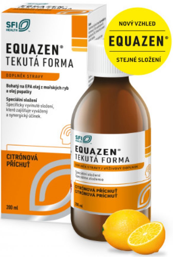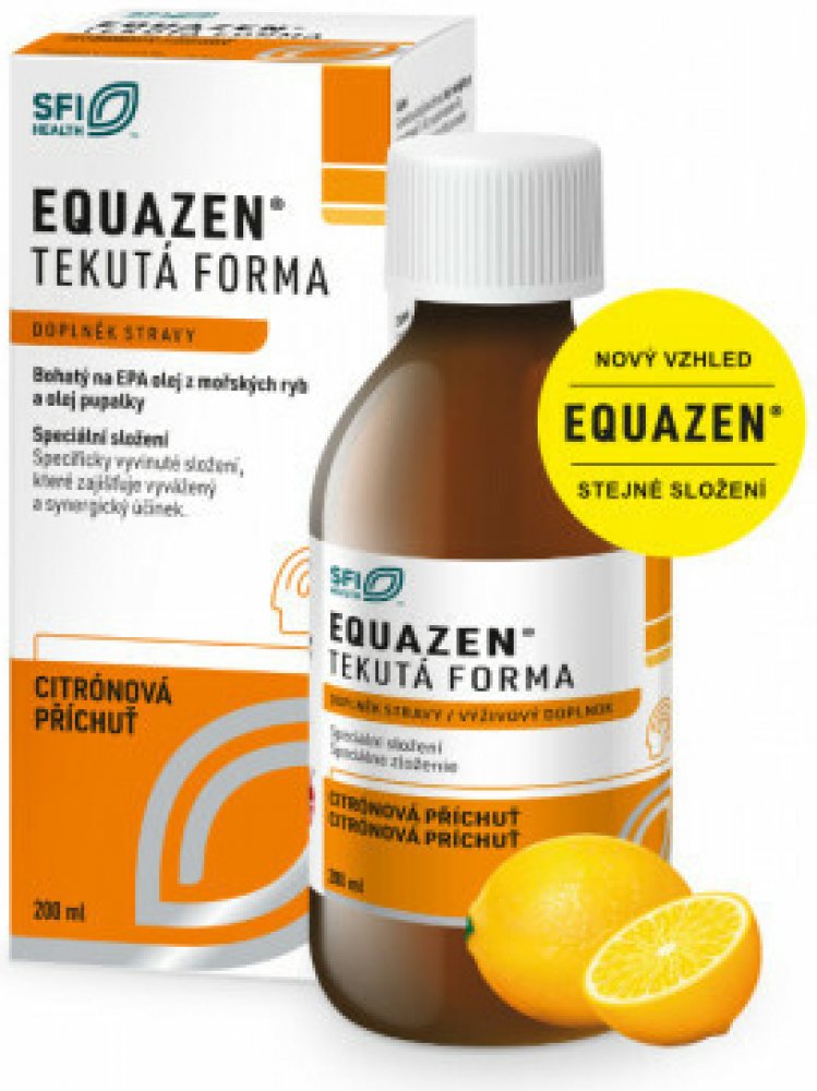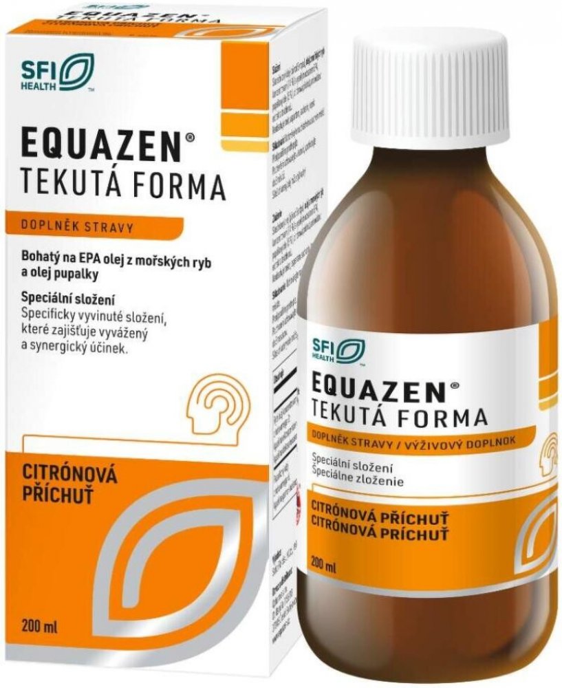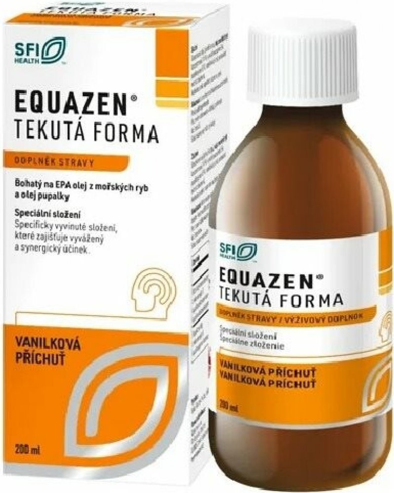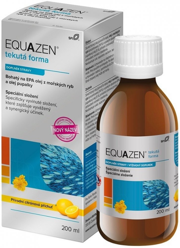 - Doplněk stravy pro děti od 1 roku a dospělé. EQUAZEN tekutá forma s příchutí vanilky 200 ml obsahuje olej z mořských ryb a pupalkový olej – speciální kombinaci vybraných mastných kyselin omega-3 a omega-6 s vysokým obsahem omega-3 EPA. Tento přírodní přípravek byl použit v řadě publikovaných, placebem kontrolovaných klinických studiích u dětí a dospívajících s potížemi s pozorností, soustředěním, čtením a psaním a opožděním ve vývoji řeči a s potížemi v chování.* EQUAZEN poskytuje organismu mastné kyseliny omega-3 EPA, omega-3 DHA a omega-6 GLA ve vyváženém poměru, který umožňuje jejich efektivní využití naším organismem.