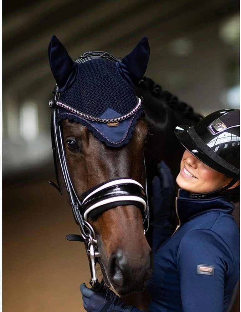 Luxusní háčkovaná čabraka v modré barvě zdobená saténovou nášivkou s kovovým štítkem Equestrian Stockholm a rosegold detaily. Čabraka chrání koně před hmyzem a trochu tlumí hluk. Elastická látka na uších pro větší pohodlí a přizpůsobení koni.