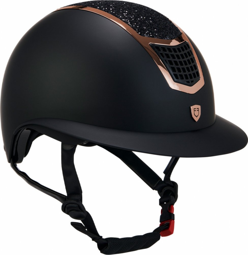 Ultralehká bezpečnostní přilba od výrobce Equestro, perfektně sedí na hlavě, moderní design, jednoduchý systém nastavení. Vybavena pohodlným a prodyšným vnitřním polstrováním, které lze vyjmout. Opatřena vynikajícím ventilačním systémem. Tento model má široký kšilt, který poskytuje ochranu před slunečními paprsky a zaručuje pohodlí. Zdobena krásnými kamínky. Helma splňuje aktuální evropskou normu ...