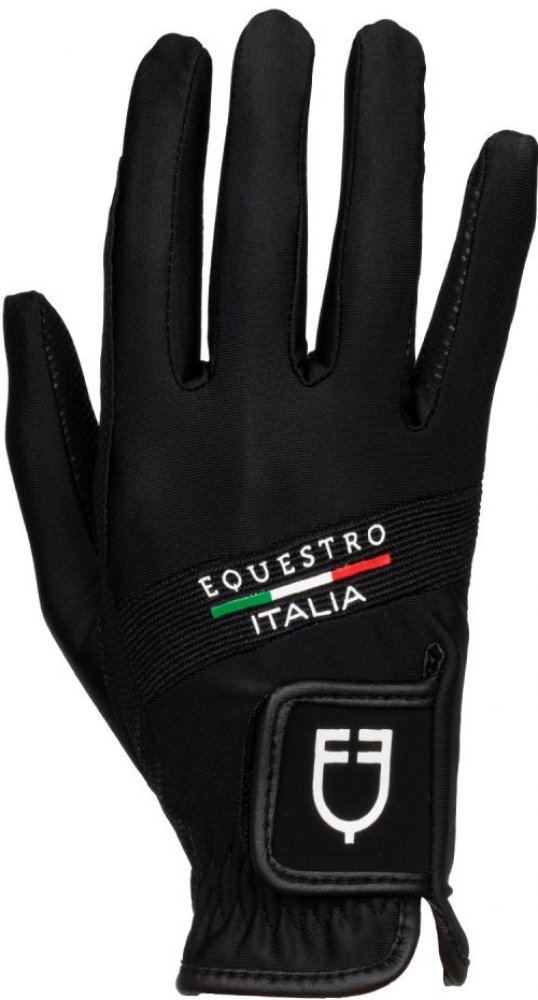 Rukavice Equestro X FISE ze strečové technické tkaniny. Ultra prodyšné a ideální pro celý rok. Logo na zapínání na suchý zip a nápis Equestro X FISE. Klíčovou vlastností rukavic je úchop na dlani, který umožňuje bezpečnější a spolehlivější držení otěží.