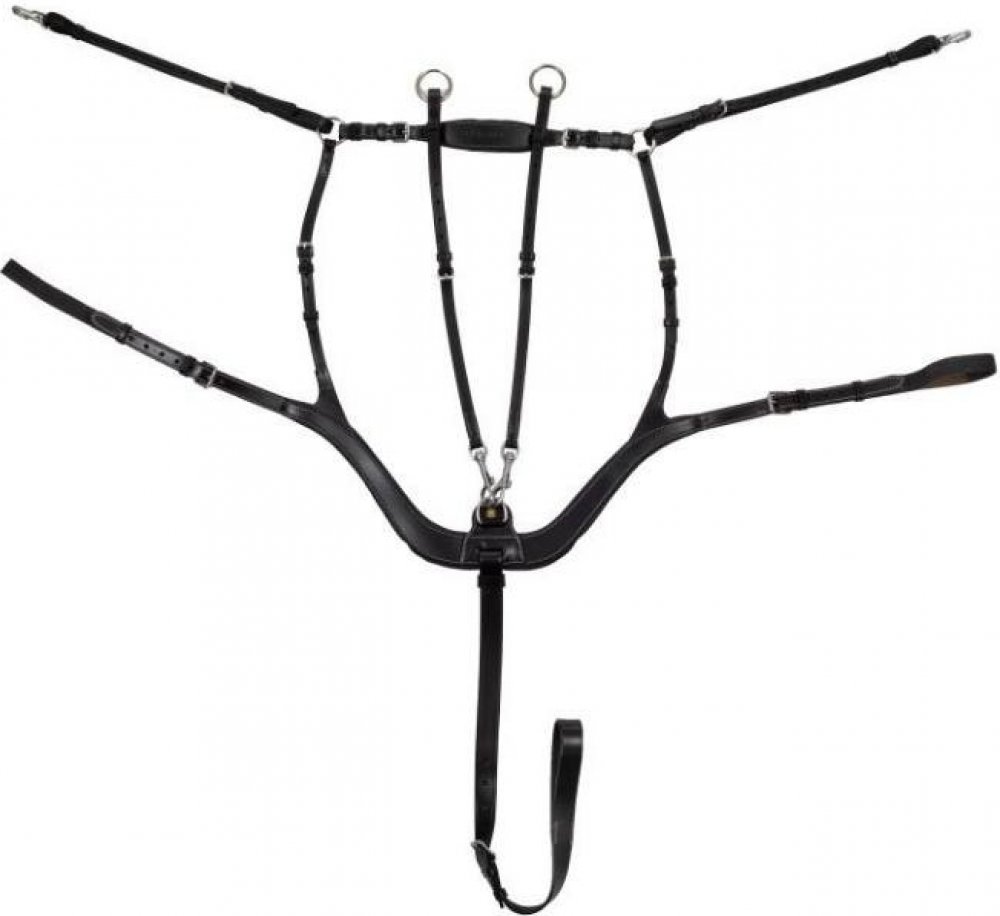 Poprsník s odnímatelným martingalem z kvalitní kůže s ocelovými přezkami od italského výrobce Equestro. Zabraňuje posouvání sedla dozadu pomocí karabinek a přezek, které se upevňují přímo k sedlu a podbřišníku. Součástí je odnímatelná martingalová vidlice, která brání nadměrnému zvedání hlavy koně tím, že působí přímo na...