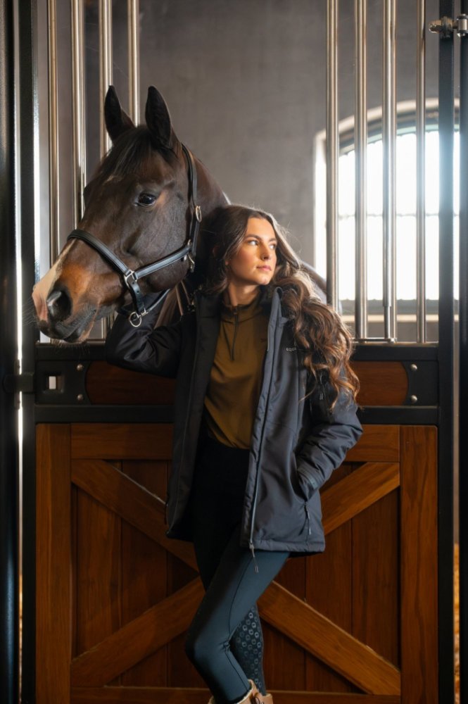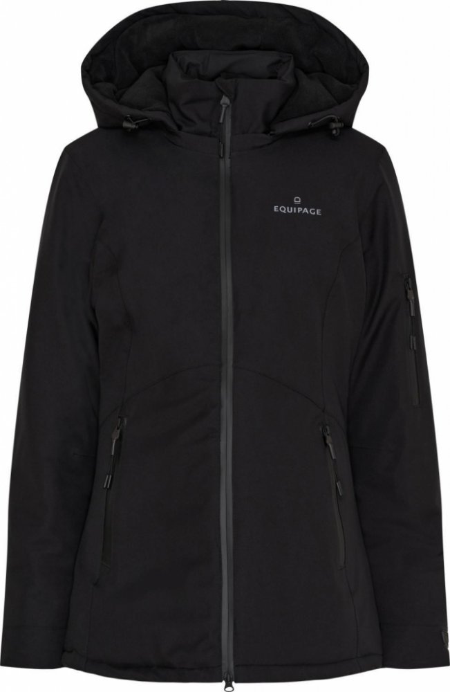 Stylová jezdecká bunda v prodlouženém střihu od značky Equipage. Vybavená dvoucestným zipem a odepínací kapucí. Má dvě přední kapsy na zip a jednu menší kapsu na zip na levém rukávu. Je voděodolná (10 000 mm) a prodyšná (8 000 g/m²/24h). Konce rukávů jsou opatřeny stahováním na suchý zip.