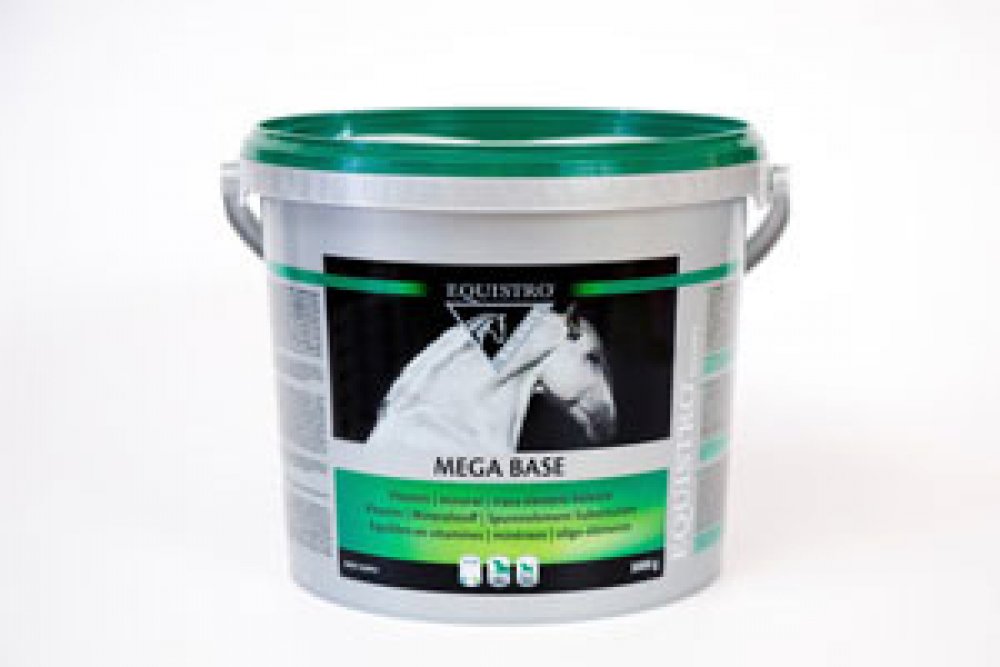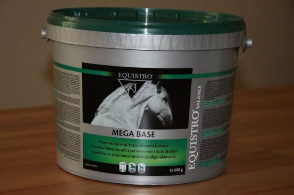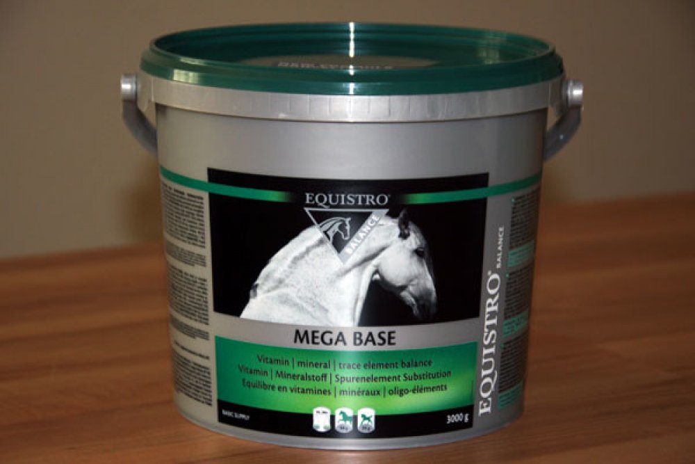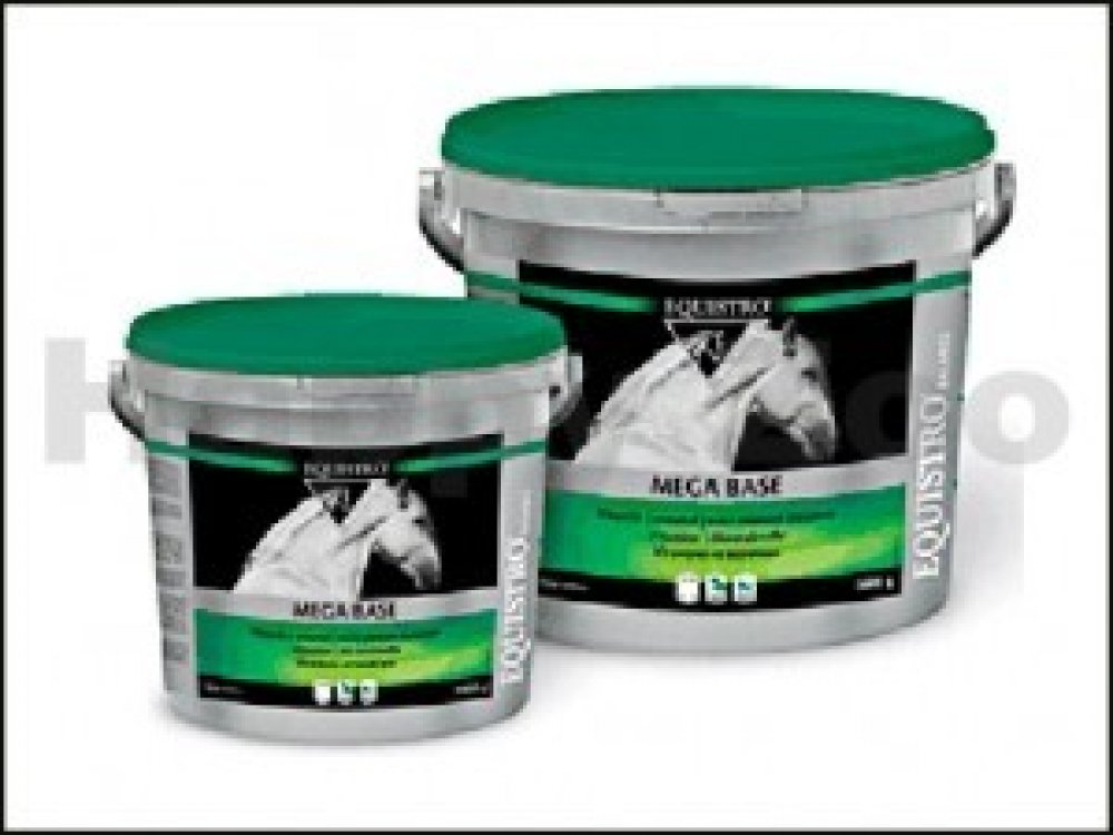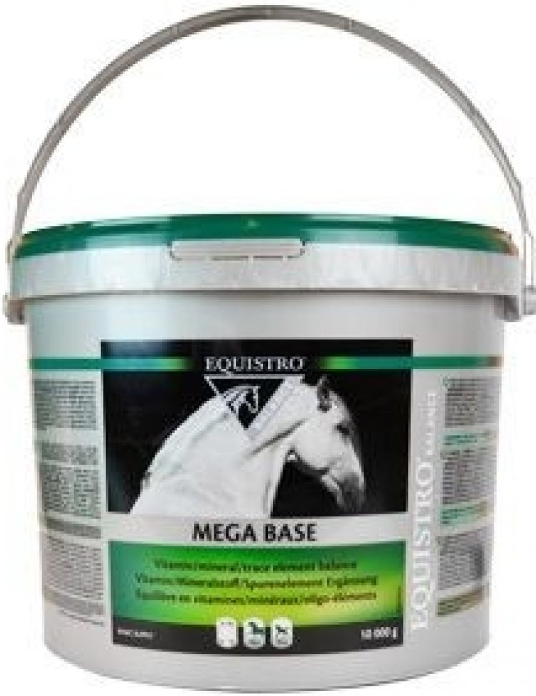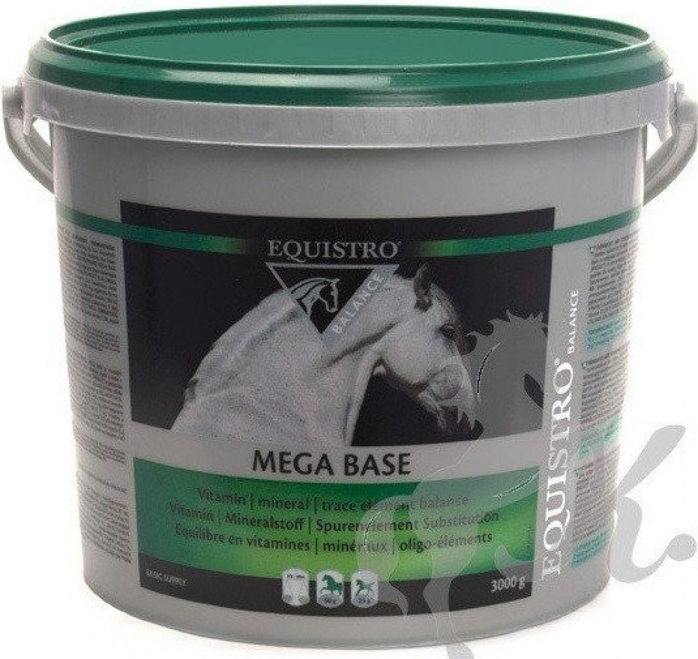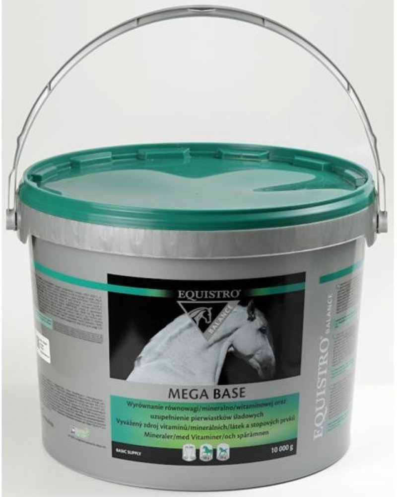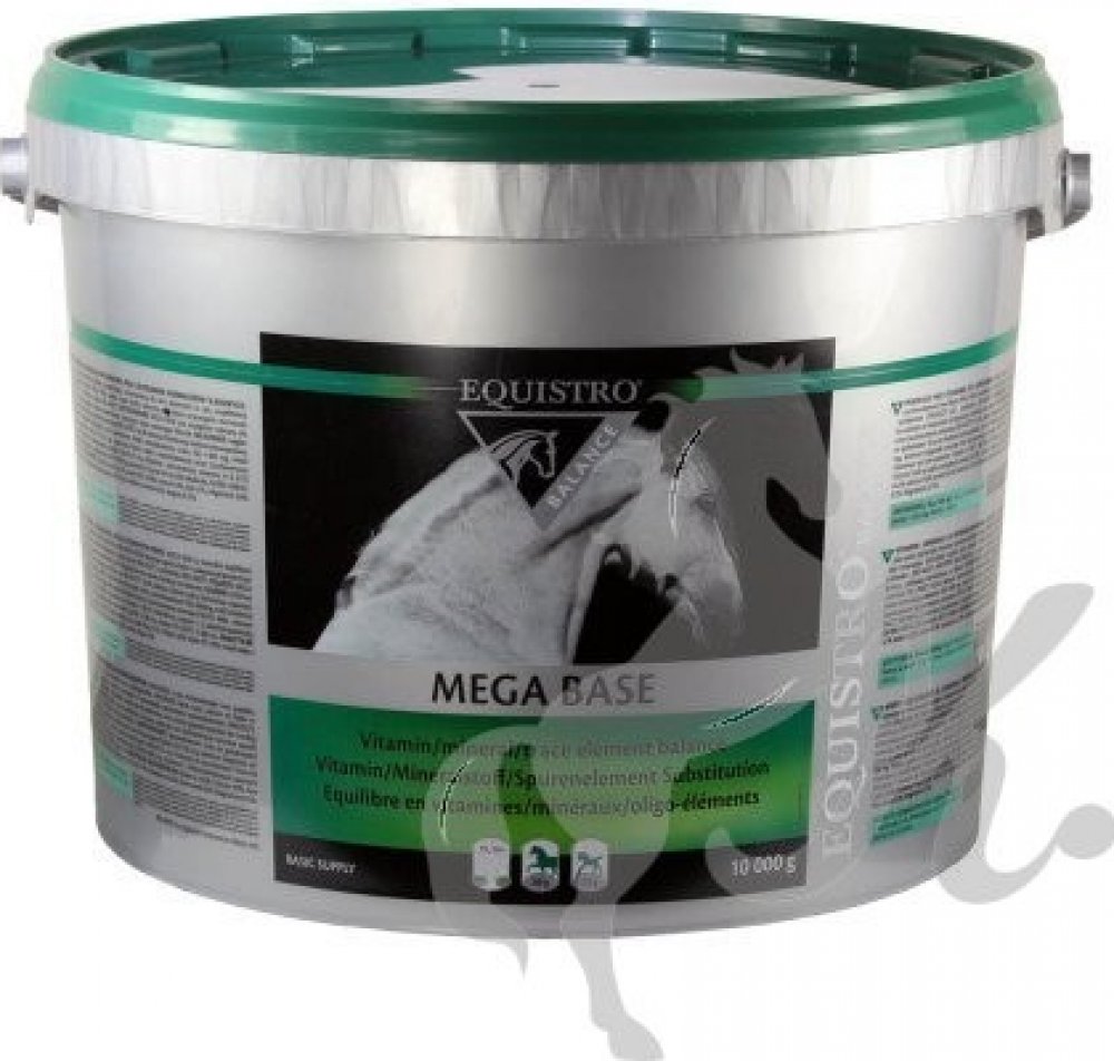 Složení Equistro Mega Base:uhličitan vápenatý, suché kvasinky Saccharomyces cerevisiae sp. (ACTIGEN®) 16,6 %, laktóza, dextróza, chlorid sodný, fosforečnan vápenatý. Doplňkové látky/kg: Stopové prvky: Chelát zinku a bílkovinných hydrátů (3b612) 4 000 mg, Chelát mědi a bílkovinných hydrolyzátů (3b407) 250 mg, selen (Inaktivované kvasinky Saccharomyces cerevisiae CNCM I-3060 obohacené selenem) (3b810) 9 mg. Vitaminy a provitaminy: Vitamin A (retinyl-acetát) (3a672a) 300 000 IU, Vitamin E/all-rac-alfa-tokoferol acetát (3a700) 4 000 IU, vitamin D3 cholekalciferol (3a671) 3 000 IU. Antioxidanty: askorbyl-palmitát (1b304) 9 900 mg. Analytické složky: hrubý popel 43 %, vápník (Ca) 10 %, vlhkost 7 %, hrubý protein 6,5 %, sodík (Na) 6,5 %, hrubý tuk 3,5 %, fosfor (P) 1,9 %, hrubá vláknina 0,3 %, hořčík (Mg) 0,2 %.Dávkování Mega Base pro koně: