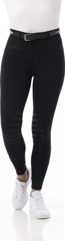 Stylové jezdecké rajtky pro děti, které spojují elegantní design s funkčními detaily. Odolný a pružný materiál zajišťuje perfektní přizpůsobení postavě, volnost pohybu a celodenní komfort. Silikonový grip v oblasti kolen zaručuje skvělou přilnavost v sedle. Přední a zadní švy jsou vkusně ozdobeny kamínky. Lze prát v pračce na 30 °C.