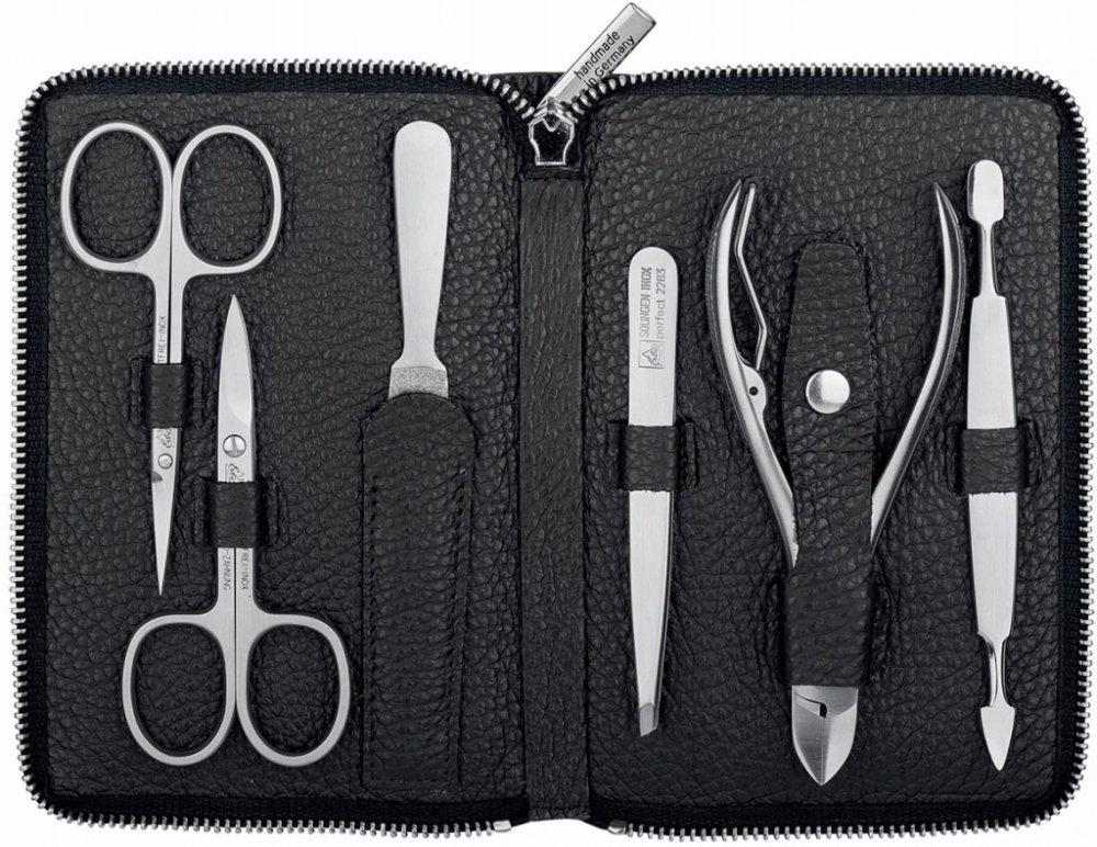 Pouzdro je vyrobeno z přírodní hovězí kůže v černé barvě a uzavírá se na zip. Měkká kůže je velmi atraktivní a příjemná na dotek. Vnitřní strana pouzdra manikúry je také z pravé kůže. Uvnitř najdete šest nástrojů, které jsou vyrobeny z nerezové, speciálně kalené oceli, odolné vůči korozi a díky tomu mají dlouhou životnost . Vzhledem k tomu, ze jsou odolné vůči korozi, můžete je skladovat i ve vlhkém prostředí. A protože jsou vyrobeny z vysoce kvalitní oceli, zůstávají neuvěřitelně dlouho ostré.