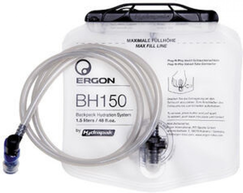 Horizontální vakový systém pro batohy řady Ergon BE vyrobený z hygienického polyuretanu, testovaného FDA. Tento extrémně silný materiál se muže vytáhnout až do osminásobku své velikosti, aniž by se porušil. Díky velkému otvoru je velmi snadné vak naplnit a čistit, protože se dá celý obrátit naruby. Extra dlouhá, speciálně navržená hadička pro batohy Ergon je vyrobena tak, že ji vůbec neucítíte. Tvoření uzlů zabrání ventil s otočným náustkem. Díky konektoru Plug and Play se dá vak odepnout od hadičky. To znamená, že vak jednoduše můžete vyčistit či naplnit, aniž byste museli složitě vyndávat hadičku z batohu. Což je veliká výhoda před jinými systémy. Integrovaný ventilek zabrání uniku tekutiny z vaku, je-li hadička odpojena. Specifikace Název: BH150 Otvírání: široké Objem: 1,5 L Hadička: Extra Long, 127 cm Materiál: Hygienic Polyurethane Kompatibilita: řady batohů Ergon BE1, BE2, BE3