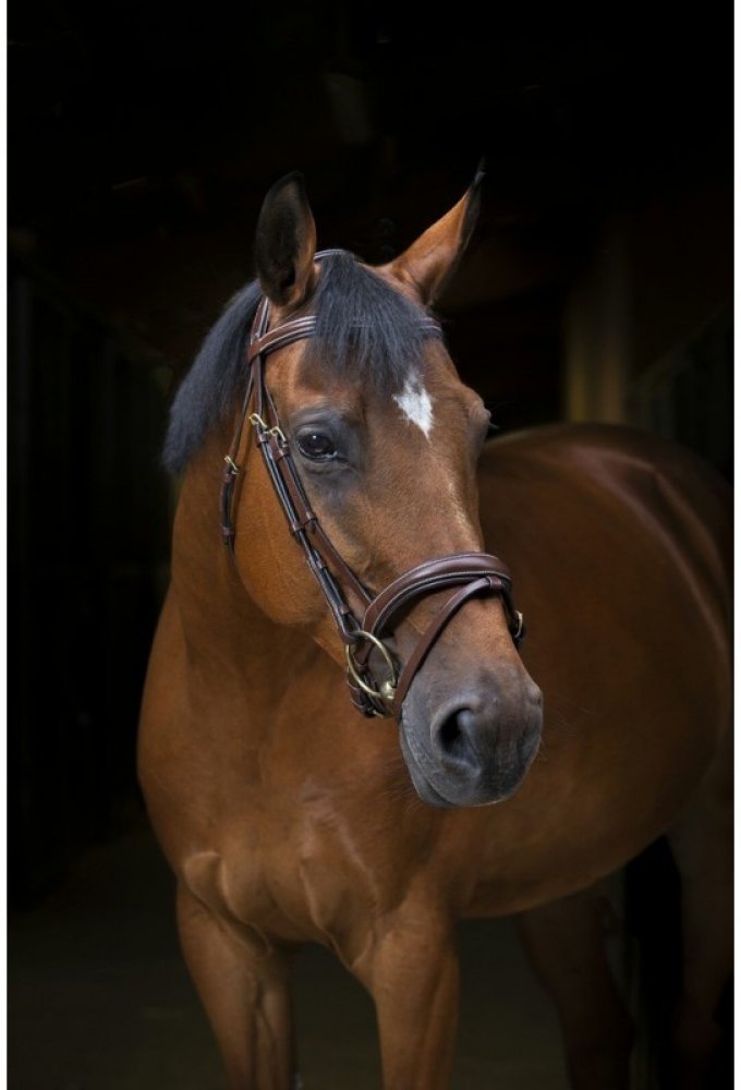 Uzdečka z buvolí kůže s širokým anatomickým výstřihem, čelenkou ve tvaru "V" a kombinovaný nánosník.