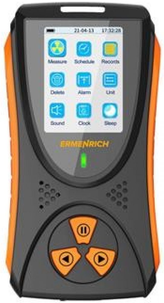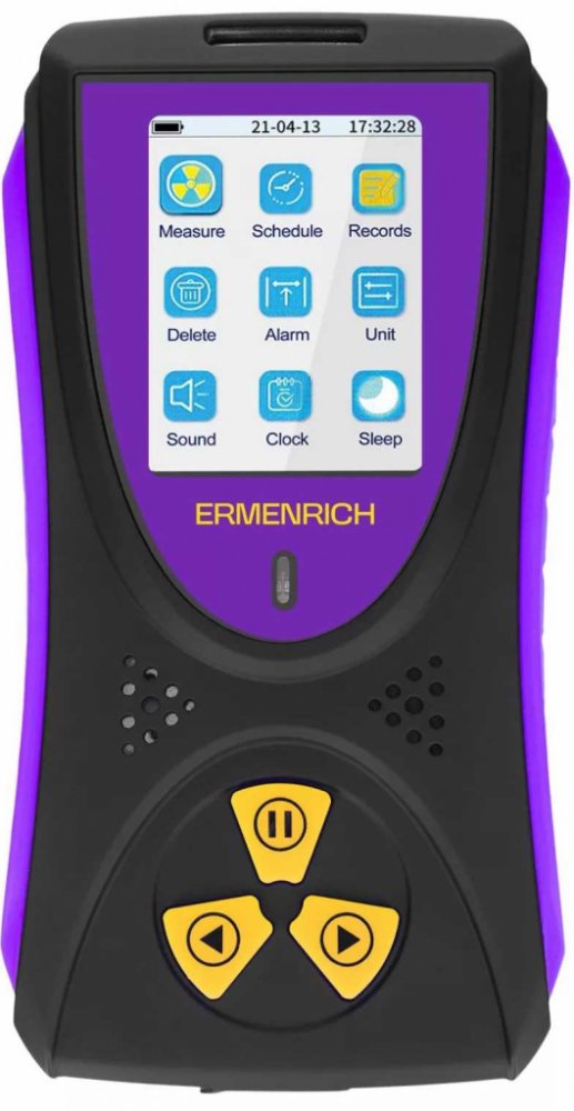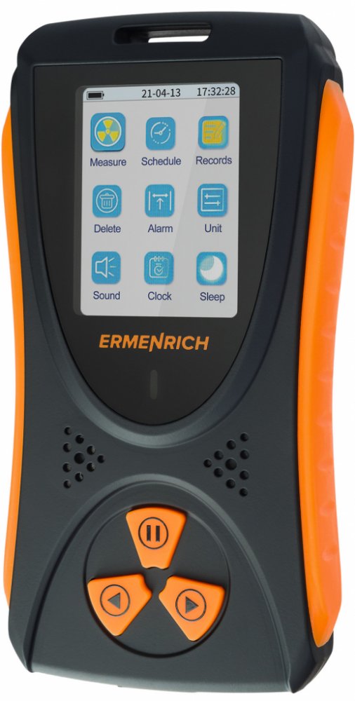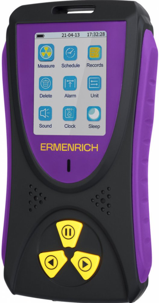 Dozimetr Ermenrich Ping RD50 je nezbytný pro měření radiace pozadí v prostředí, vodě, potravinách, budovách a předmětech pro domácnost. Geiger-Mullerův čítač může měřit záření gama, beta a rentgenové záření v rozsahu od 0,05 µSv do 50 mSv. Při překročení přípustné úrovně vydává zařízení zvukovou a světelnou výstrahu.