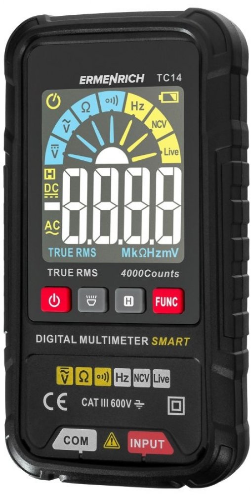 Digitální multimetr Ermenrich Zing TC14 s funkcí Smart je přenosný elektrický měřicí a testovací přístroj pro profesionální i domácí použití. Po aktivaci automaticky detekuje příchozí signál a provádí měření. Funkce Smart funguje ve všech režimech měření kromě měřiče frekvence. V případě potřeby můžete přístroj ovládat ručně stisknutím tlačítka. Přístroj automaticky nastaví mezní hodnotu měření v libovolném provozním režimu. Všechna měření jsou založena na skutečné efektivní hodnotě. V tomto modelu je test kontinuity kombinován s režimem měření odporu. K dispozici je funkce NCV, která slouží k vyhledávání skrytých kabelů, a fázový detektor. Pokud pracujete v takových podmínkách, kdy je obtížné přečíst hodnoty na displeji multimetru, doporučuje se vyzkoušet funkci přidržení zobrazení naměřené hodnoty. Stisknutím tlačítka „zmrazíte“ naměřené hodnoty, abyste si je mohli přečíst později. Klíčové vlastnosti digitálního multimetru ERMENRICH Zing TC14True RMS - vysoká přesnost měření díky...