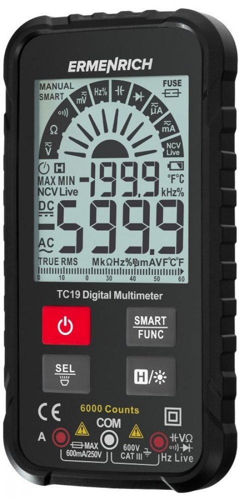 Digitální multimetr Ermenrich Zing TC19 je nezbytným nástrojem pro každodenní práci profesionálního elektrikáře. Pomáhá při testování elektrických spotřebičů a elektroinstalace a při hledání závad v elektrickém vybavení automobilu. Díky kompaktnímu a lehkému designu se snadno přenáší a jednoduché ovládání usnadňuje běžnou práci. Multimetr poskytuje vysokou přesnost měření, protože používá výpočty True RMS. Multimetr měří napětí, odpor, proud, frekvenci, kapacitu a pracovní cyklus. Mezi další funkce patří testování přerušených obvodů nebo zkratů v sítích, testování diod, bezkontaktní detekce napětí (NCV) a detekce fáze. Funkce Smart usnadňuje měření základních charakteristik elektrického signálu. Funkce přidržení zobrazení naměřené hodnoty je užitečná, když chcete „zmrazit“ naměřené údaje na displeji a zkontrolovat je později. Klíčové vlastnosti digitálního multimetru ERMENRICH Zing TC19Multifunkční digitální multimetrKombinuje funkce voltmetru, ampérmetru, ohmmetru, měřiče kapacity,...