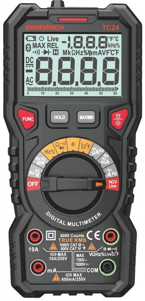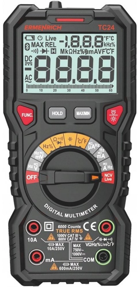 Digitální multimetr Ermenrich Zing TC24 je profesionální přístroj pro testování elektrických sítí a zařízení a měření parametrů, jakož i měření takových parametrů, jako je odpor, napětí, proud, pracovní cyklus, frekvence, kapacita a teplota. Výpočet skutečné efektivní hodnoty zajišťuje vysokou přesnost měření. Automatická volba mezních hodnot měření usnadňuje používání přístroje. Multimetr je kompaktní a spolehlivý přístroj napájený standardními bateriemi. Lze jej použít nejen k měření, ale také k provádění různých testů. Dokáže lokalizovat zkraty, přerušené obvody nebo nefunkční diody, detekovat fáze a vyhledat skryté kabely nebo jiná vysokonapěťová zařízení. K dispozici je funkce přidržení zobrazení naměřené hodnoty, která „zmrazí“ údaje na displeji. Tato funkce se hodí, když je multimetr těžko dosažitelný k tomu, abyste se mohli okamžitě podívat na displej, a můžete tak učinit později. Přístroj Ermenrich Zing TC24 má také svítilnu pro práci na špatně osvětlených nebo tmavých místech. Přístroj je napájen bateriemi a má funkci automatického vypnutí, pokud se delší dobu nepoužívá.