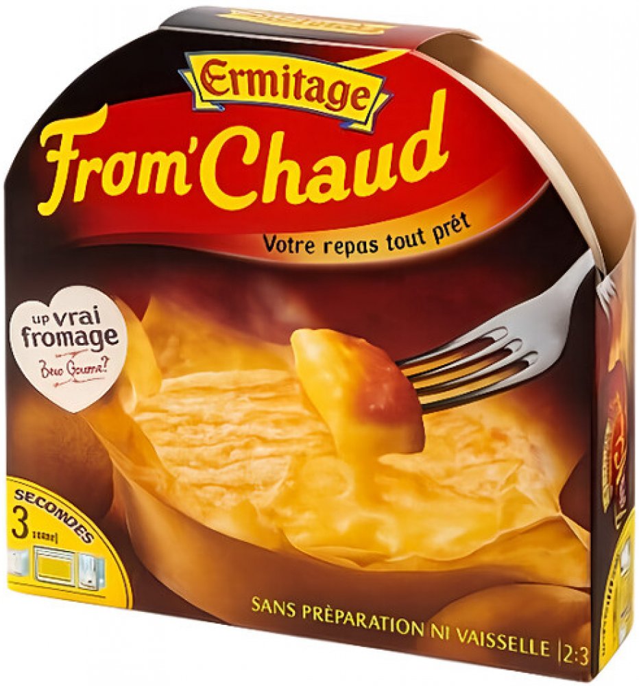 -- Rozpékací sýr Ermitage From'Chaud – obdoba tradičního fondue. Jednoduchá příprava v troubě či mikrovlnné troubě. Porce pro 4 osoby.