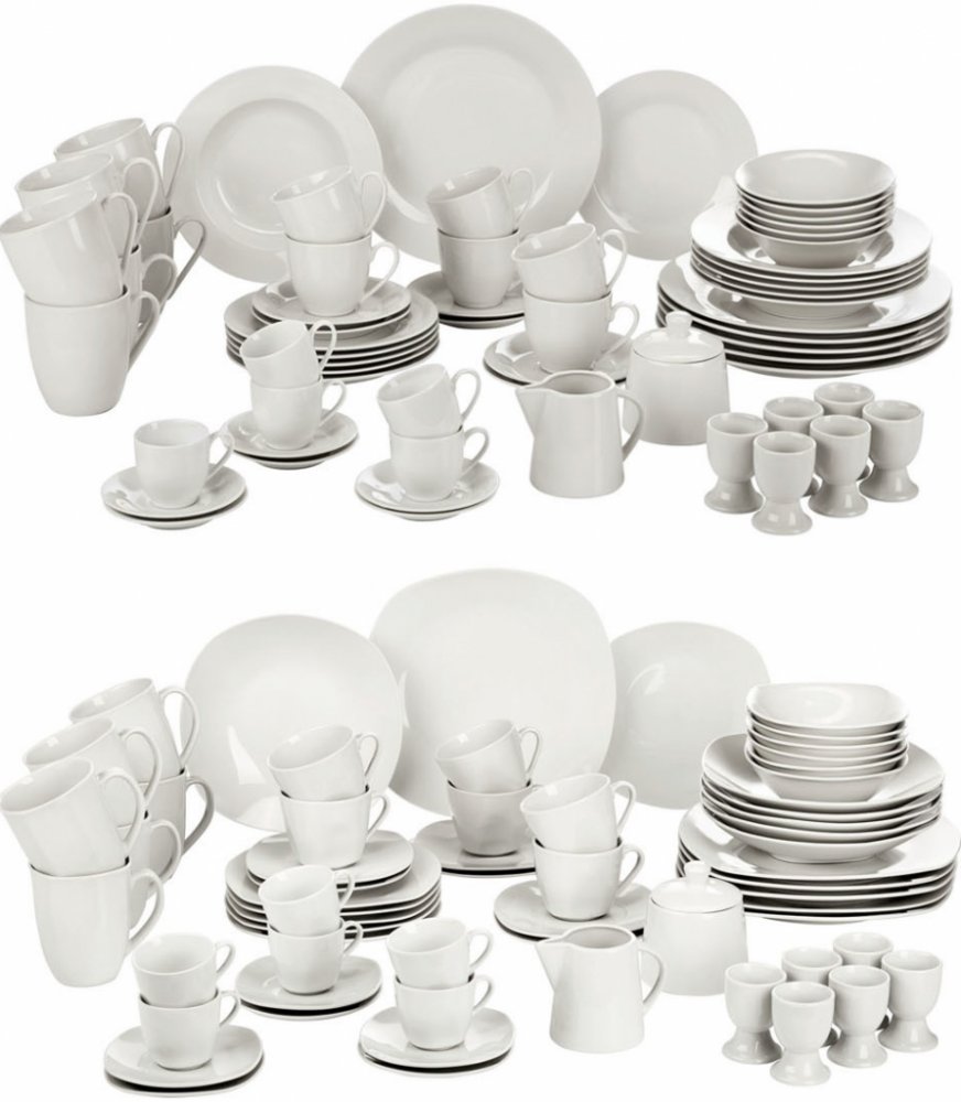 ERNESTO® Porcelánový servis, 62dílný Vhodný do myčky na nádobí i mikrovlnné trouby Obsah balení 6x mělký talíř 6x hluboký talíř 6x dezertní talíř 6x šálek na kávu 6x podšálek 6x šálek na espreso 6x podšálek na espreso 6x snídaňová miska 6x hrneček na kávu 6x pohárek na vajíčko 1x cukřenka s víčkem 1x mlékovka Materiál Porcelán Rozměry Šálek na kávu: cca 200 ml Mlékovka: cca 220 ml Hranaté provedení se zaobleným okrajem Talíř: cca 25,4 x 25,4 cm Hluboký talíř: cca 21,9 x 21,9 cm Dezertní talířky: cca 19,2 x 19,2 cm Podšálek: cca 15 x 15 cm Šálek na espreso: cca 100 ml Podšálek na espreso: cca 12,3 x 12,3 cm Snídaňová miska: cca 360 ml Hrnečky na kávu: cca 370 ml Kulaté provedení Talíř: Ø cca 26,8 cm Hluboký talíř: Ø cca 21,5 cm Dezertní talířky: Ø cca 19 cm Podšálek: Ø cca 14,7 cm Šálek na espreso: cca 90 ml Podšálek na espreso: Ø cca 11,2 cm Snídaňová miska: cca 330 ml Hrnečky na kávu: cca 420 ml