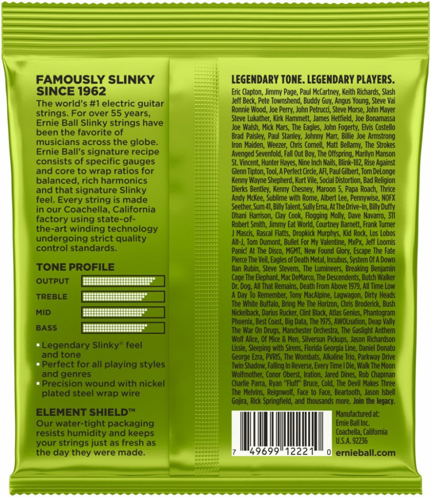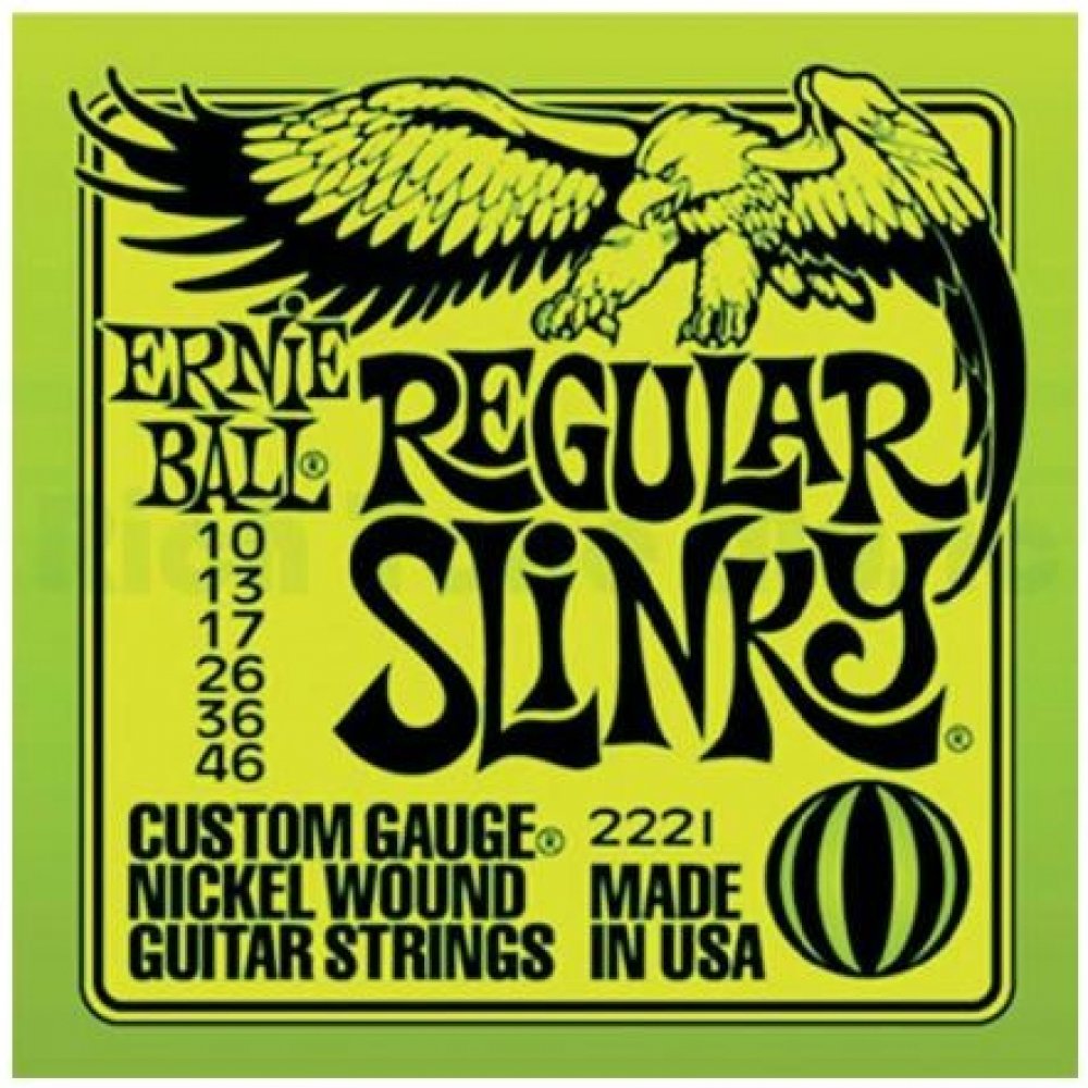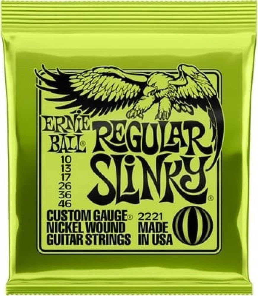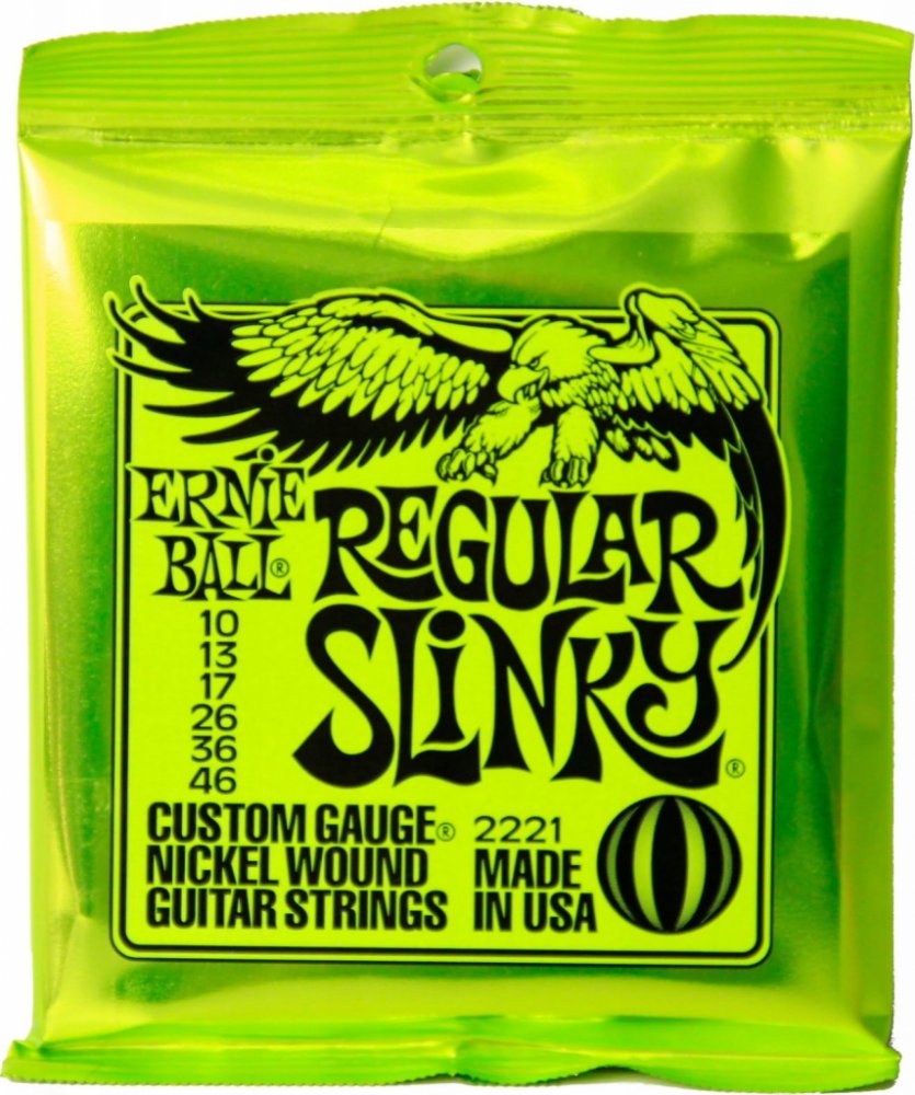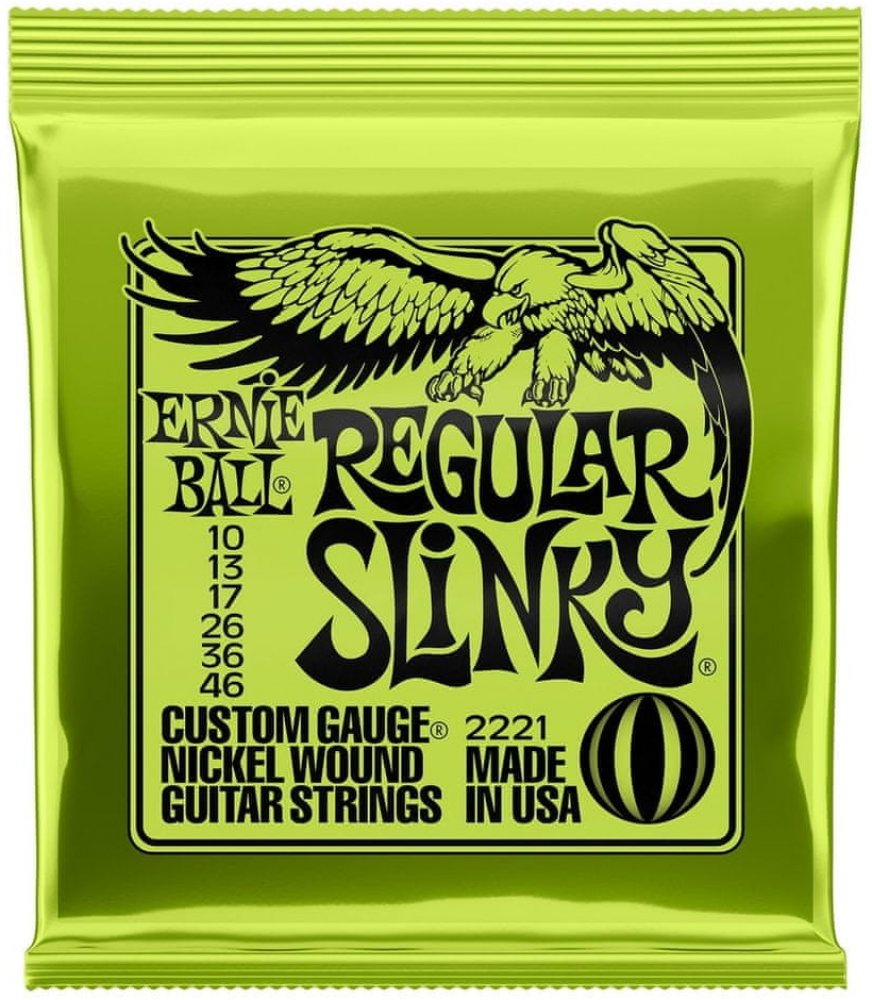 Struny pro elektrickou kytaru Struny Slinky Nickel Wound značky Ernie Ball jsou mezi strunami pro elektrické kytary naprostým bestsellerem a zlatým standardem. Vynikají zejména kvalitou použitých materiálů, precizním zpracováním a zvukovou všestranností, díky níž se uplatní v téměř jakémkoliv hudebním žánru. Jejich základem je šestihranné ocelové jádro a válcové vinutí z poniklované oceli. Výsledkem je frekvenčně vyvážený tón, který se uplatní v rockové, metalové, popové i bluesové hudbě.