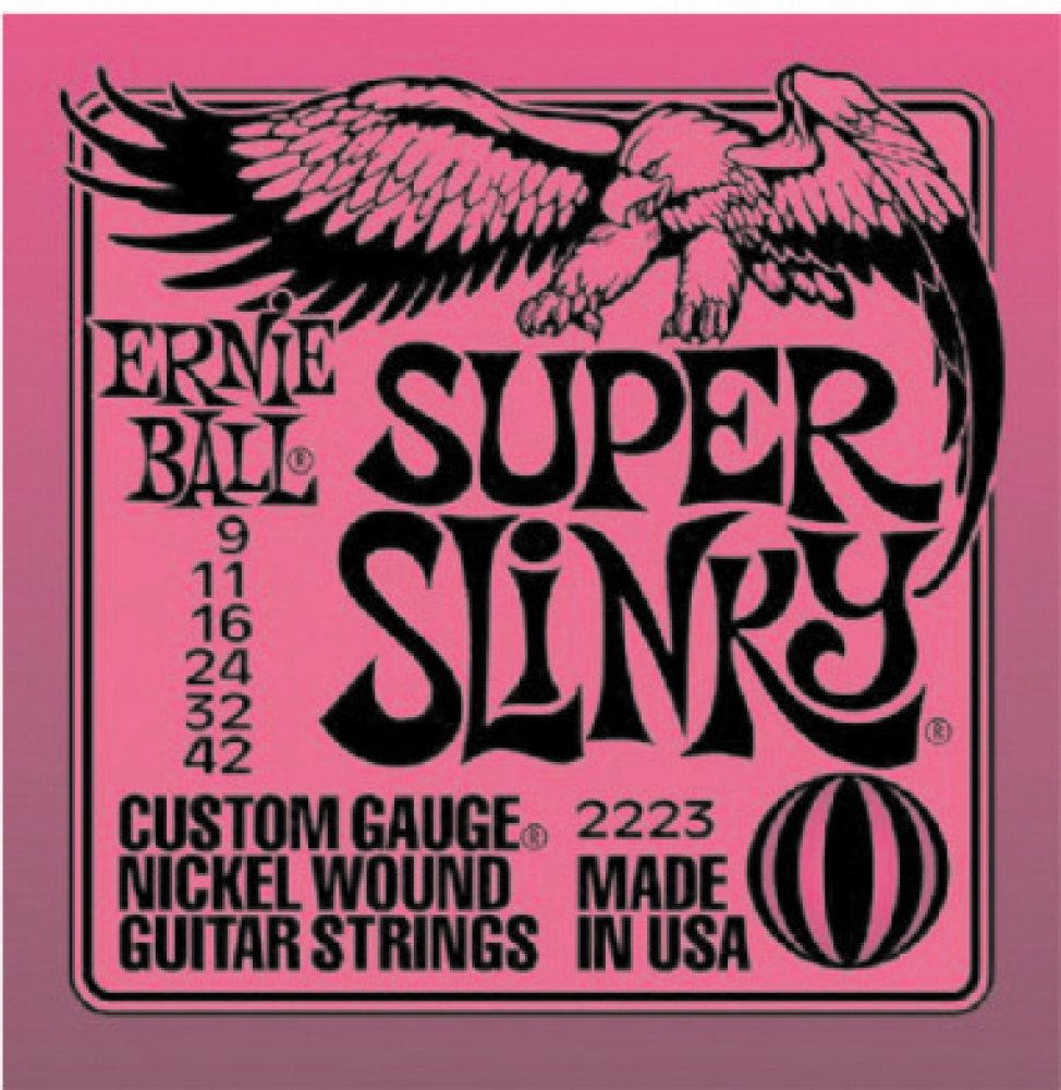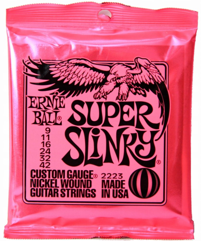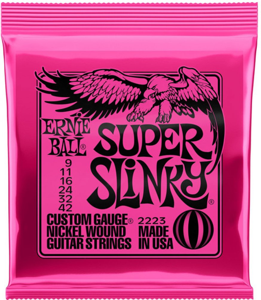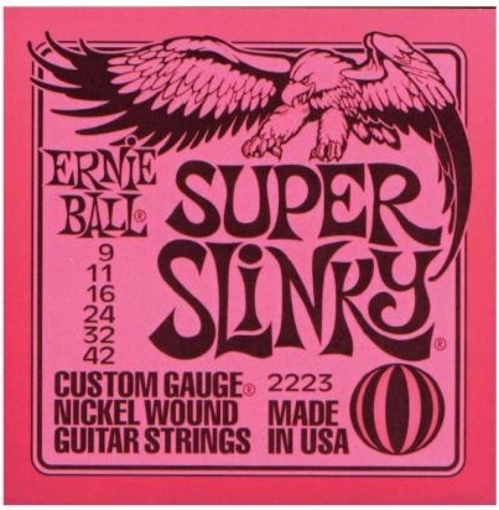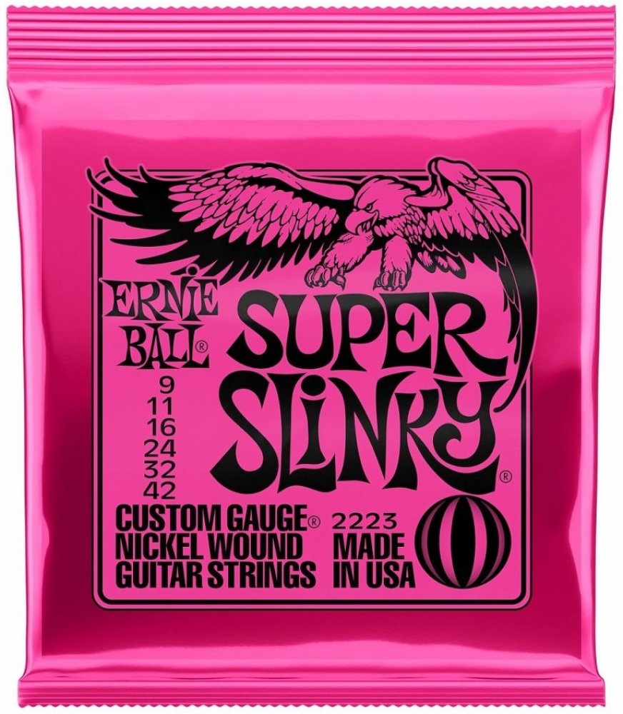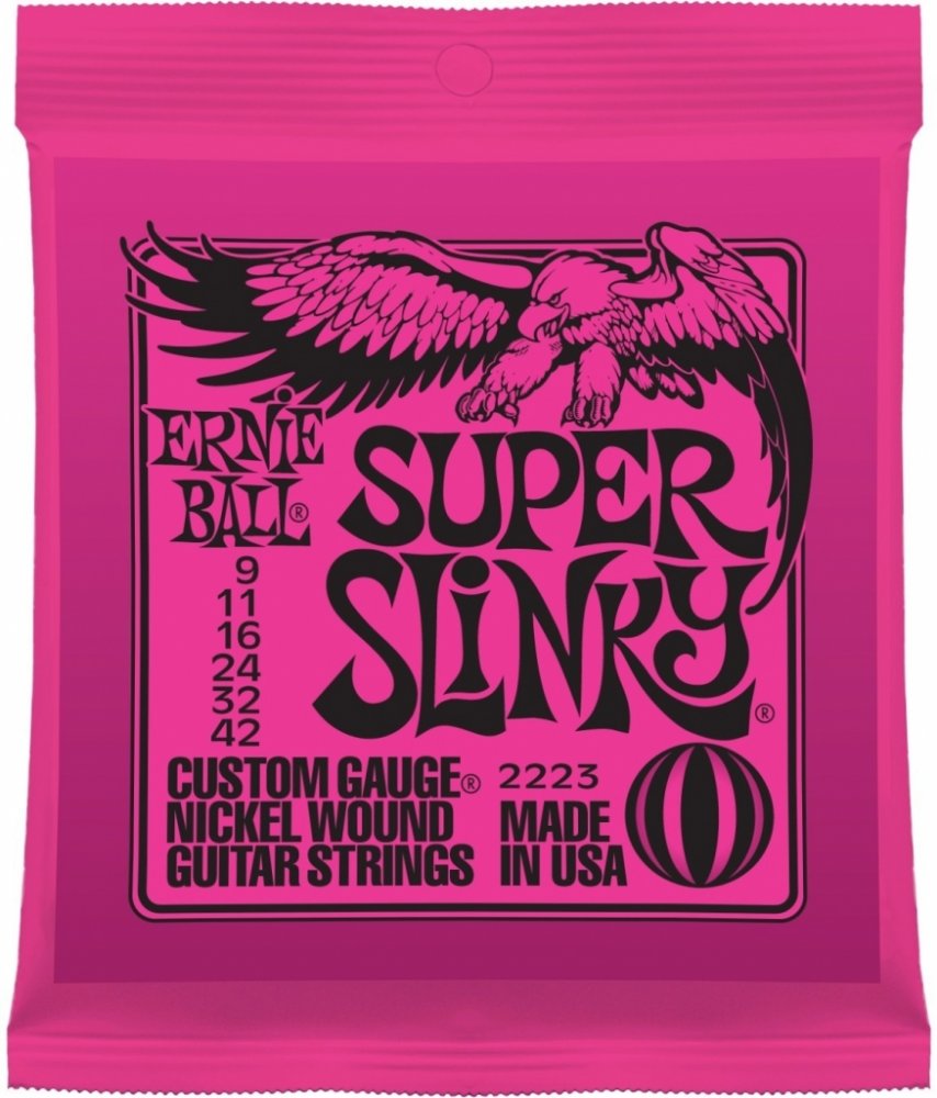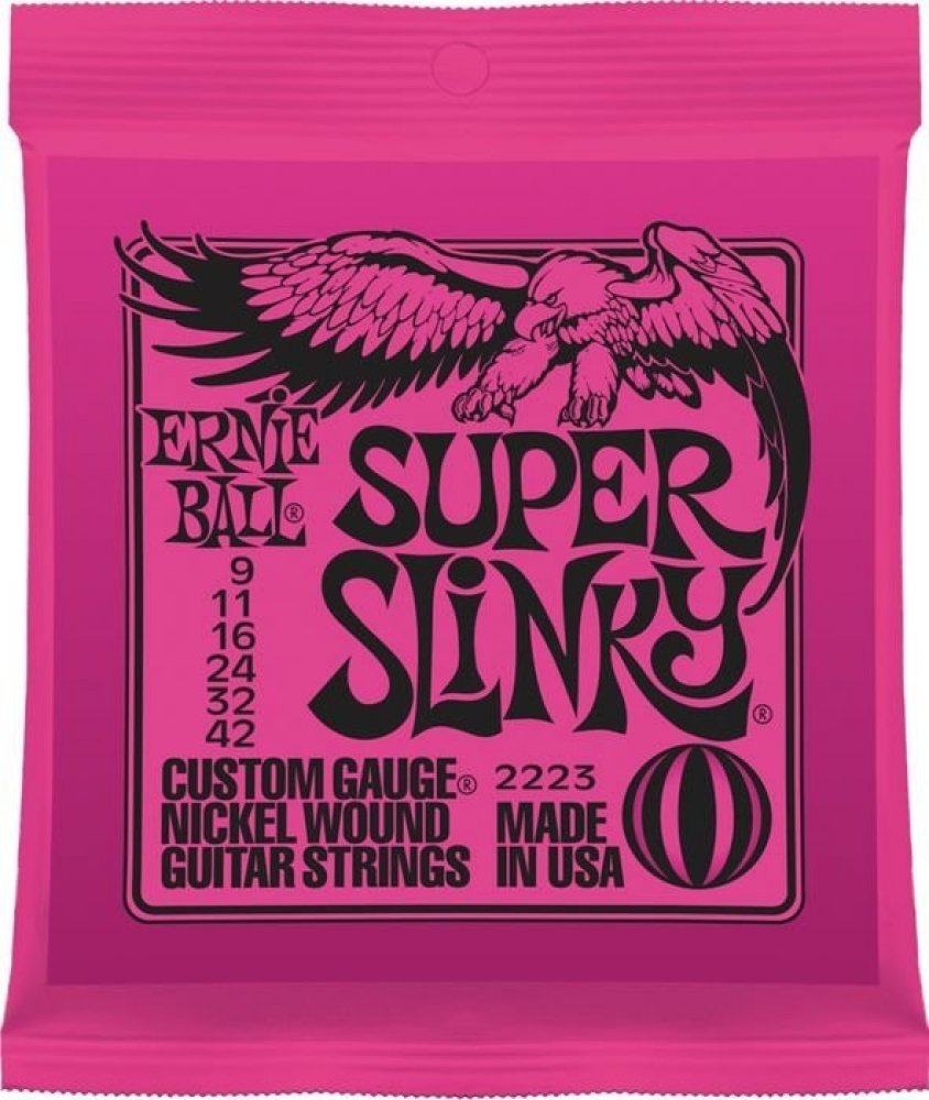 Struny pro elektrickou kytaru Struny Slinky Nickel Wound značky Ernie Ball jsou mezi strunami pro elektrické kytary naprostým bestsellerem a zlatým standardem. Vynikají zejména kvalitou použitých materiálů, precizním zpracováním a zvukovou všestranností, díky níž se uplatní v téměř jakémkoliv hudebním žánru. Jejich základem je šestihranné ocelové jádro a válcové vinutí z poniklované oceli. Výsledkem je frekvenčně vyvážený tón, který se uplatní v rockové, metalové, popové i bluesové hudbě. Tloušťky jednotlivých strun: .009/.011/.016/.024w/.032/.042