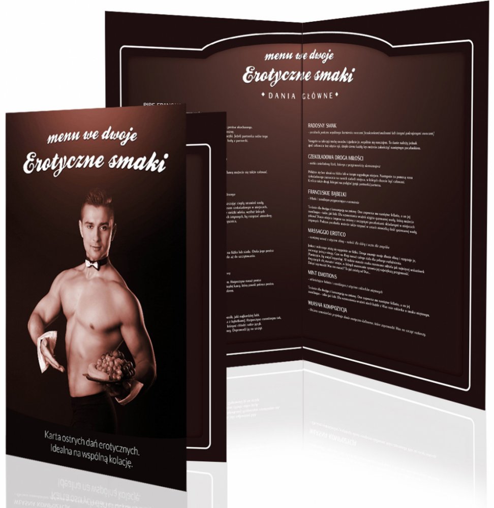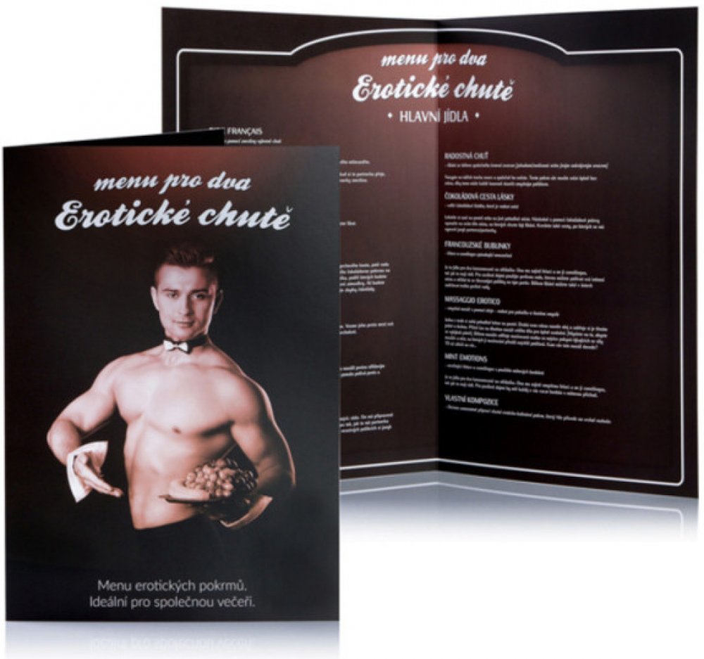Chystáte pro svého partnera jedinečnou oslavu na svatého Valentýna, nebo výročí? Připravte výbornou večeři a do středu stolu naservírujte toto speciální menu, v němž si může Váš partner vybrat další chod večeře. Menu obsahuje 12 erotických pochoutek v podobě dezertů, nápojů i hlavního chodu. Jedinečná erotická hra Menu pro dva Erotické chutě Vám připraví nevšední romantický večer, který bude plný rozkoše, erotiky a lásky. Okuste z menu například Krémový polibek, nebo Čokoládovou cestu lásky a nechte se unést svou vášní. Tato erotická hra je příjemným zpestřením milostného vztahu. Udělejte si se svou láskou krásný večer plný erotiky! Menu pro dva Erotické chutě je originální dárek k Valentýnu nebo výročí.