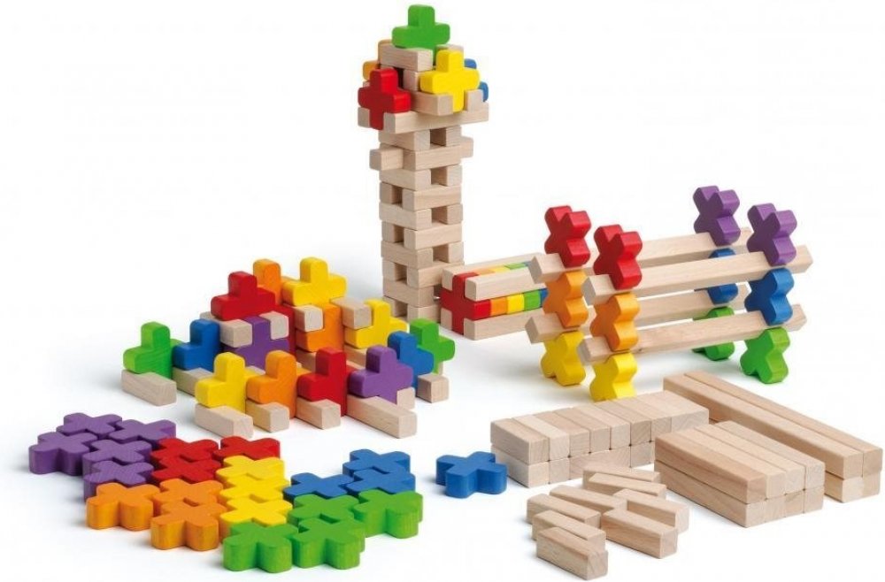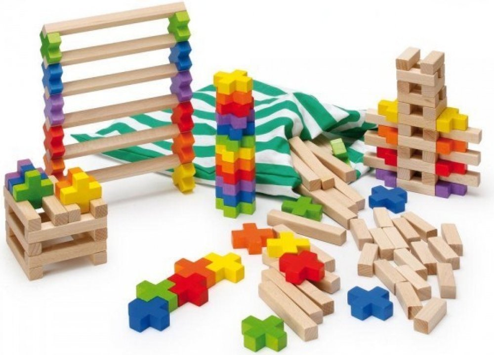 150 dřevěných kostiček - křížků a různě dlouhých hranolů.