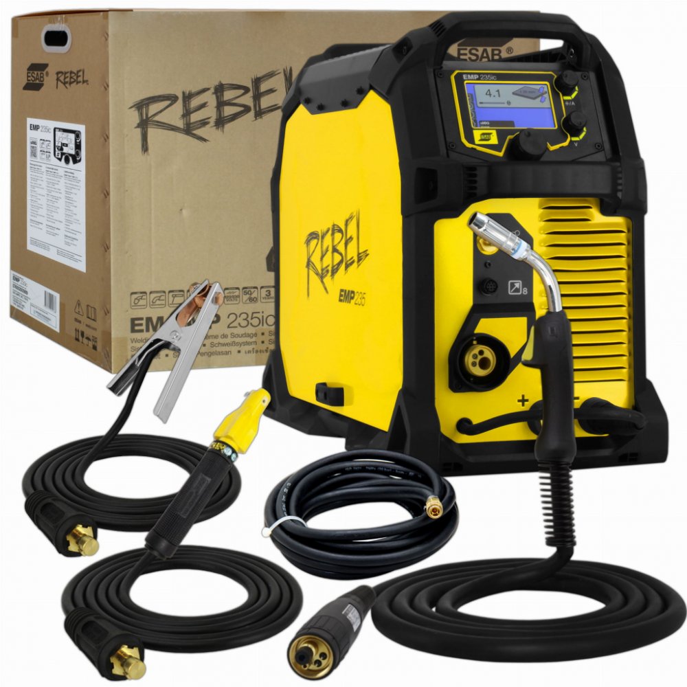 ESAB Rebel EMP 235ic je dvounapěťový zdroj, který lze použít jak v síti 230 V, tak i 120 V. Jedná se o přenosný, multifunkční zdroj, který poskytuje vynikající výkon a mimořádně stabilní oblouk pro všechny metody svařování - MIG/MAG, FCAW (trubičkový drát), TIG (s LA startem) a MMA (obalená elektroda). Rebel EMP 235ic vykazuje vynikající vlastnosti i při svařování s celulózovými elektrodami typu E6010 a E6011. Rebel EMP 235ic je určen pro cívky drátu o průměru 100, 200 a 300 mm (max. 18 kg) a umožňuje použití drátu o průměrech 0,6 - 1,0 mm (ocel), 0,8 - 1,1 mm (nerez) a 0,8 - 1,2 mm (hliník).