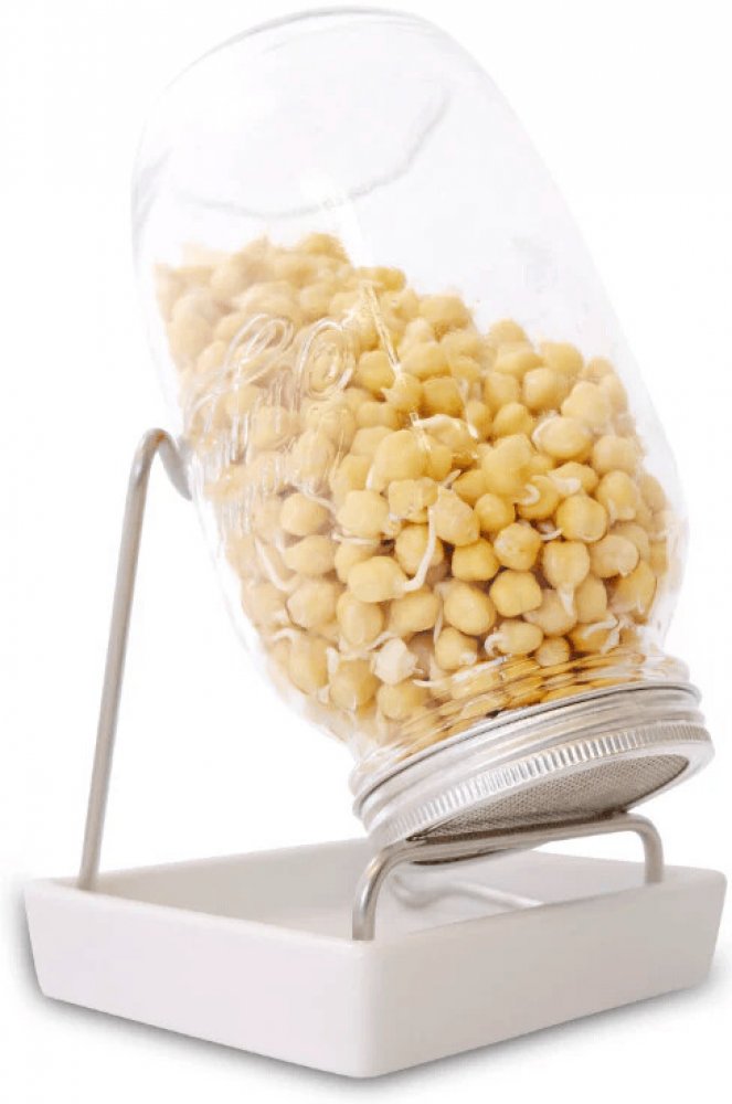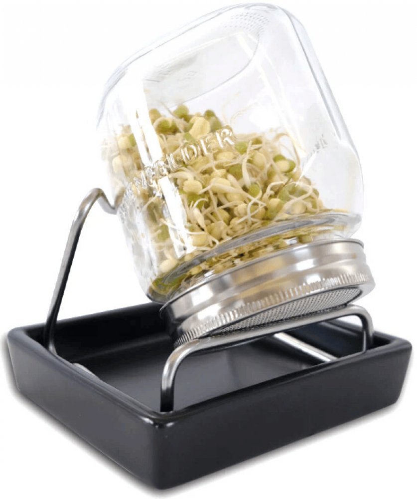 Náš systém klíčicích sklenic umožňuje snadné a hygienické pěstování klíčků bez použití půdy. Šikmá poloha sklenice zajišťuje optimální podmínky pro růst – přebytečná voda může volně odtékat (čímž se zabraňuje přemokření), zatímco jemné sítko umožňuje cirkulaci vzduchu. Keramická miska zachytává odkapávající vodu, takže lze systém bezpečně umístit kamkoliv v domácnosti.