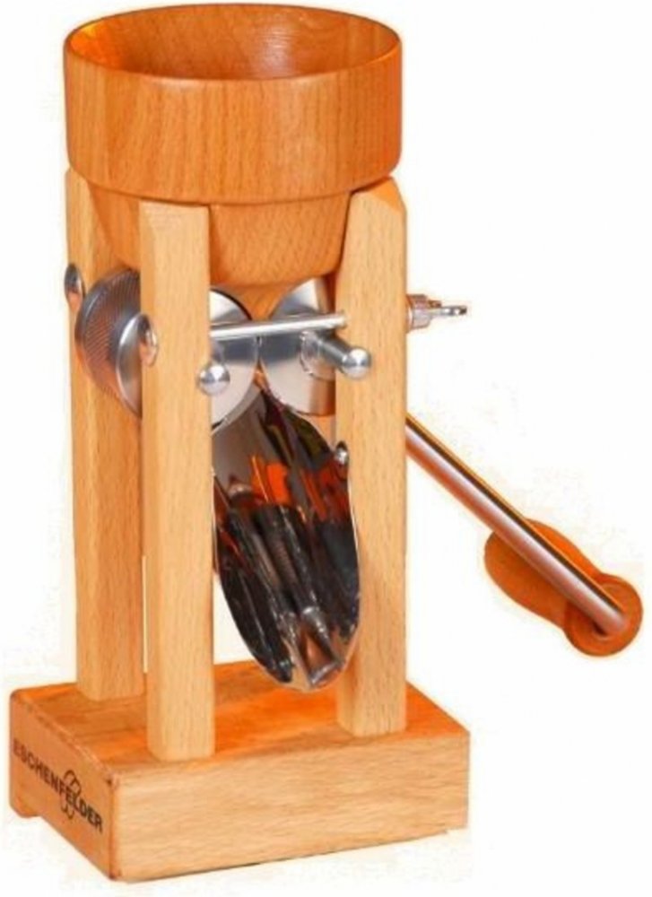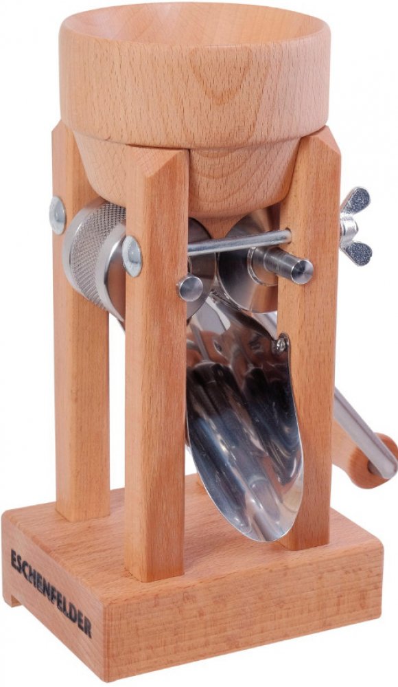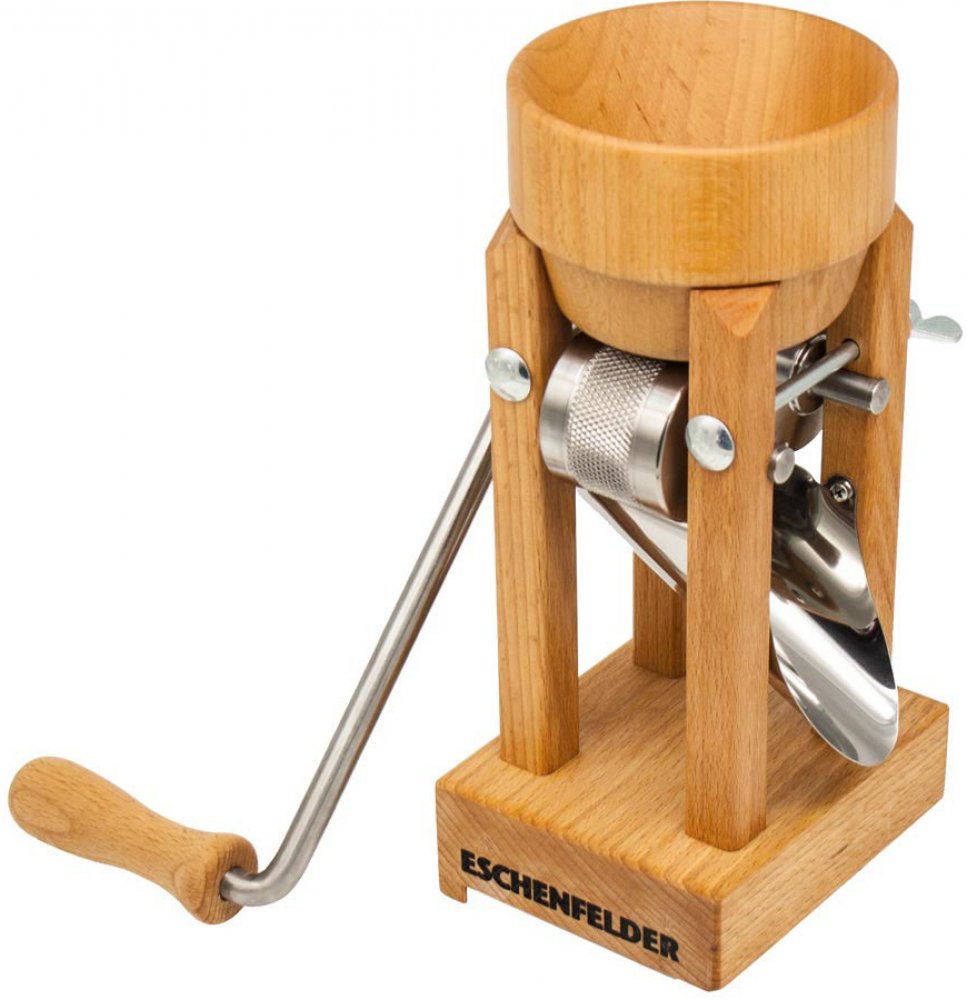 Dva válečky z nerez oceli se po vhození zrn automaticky přizpůsobují jejich velikosti. Neobsahují nikl, a tudíž jsou zdravotně nezávadné. A protože nejsou schované pod pláštěm, snadno je očistíte například s pomocí starého kartáčku na zuby. Vločkovač Eschenfelder je vyroben z masivního bukového dřeva (včetně násypky) a ošetřen lněným olejem v bio kvalitě. Balení obsahuje vločkovač, dřevěnou násypku (sundavací), držák ke stolu a štěteček na čištění.
