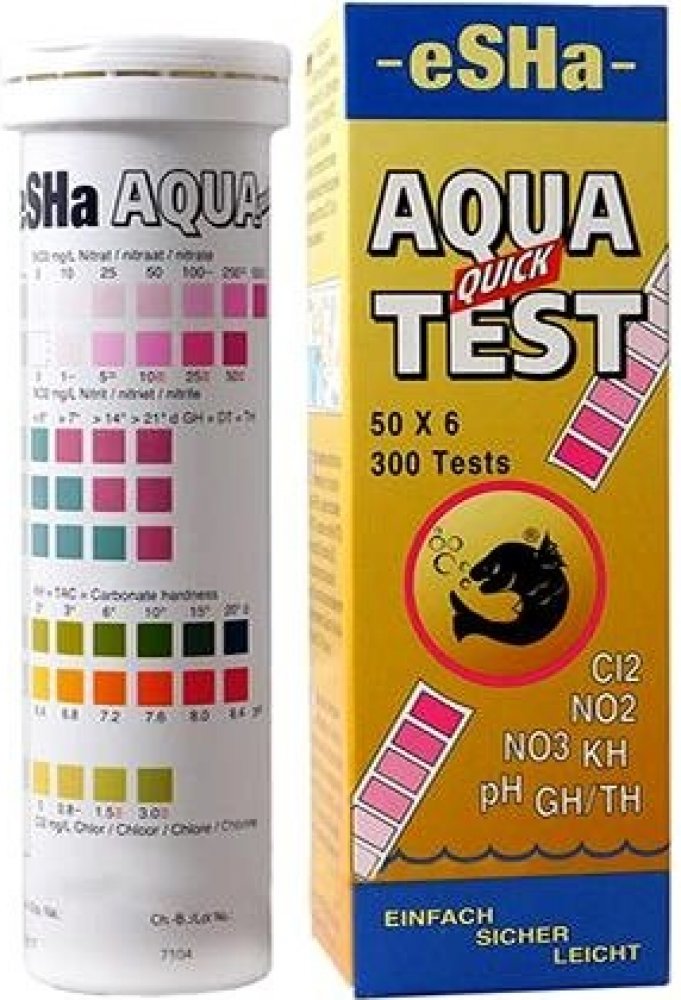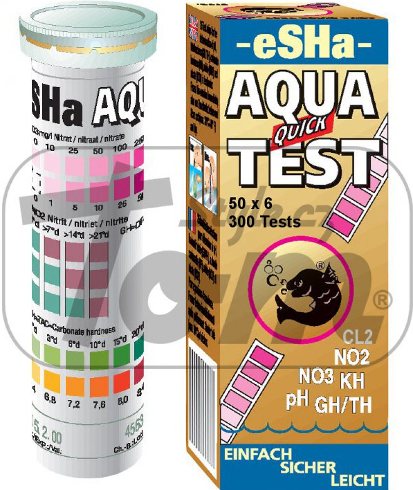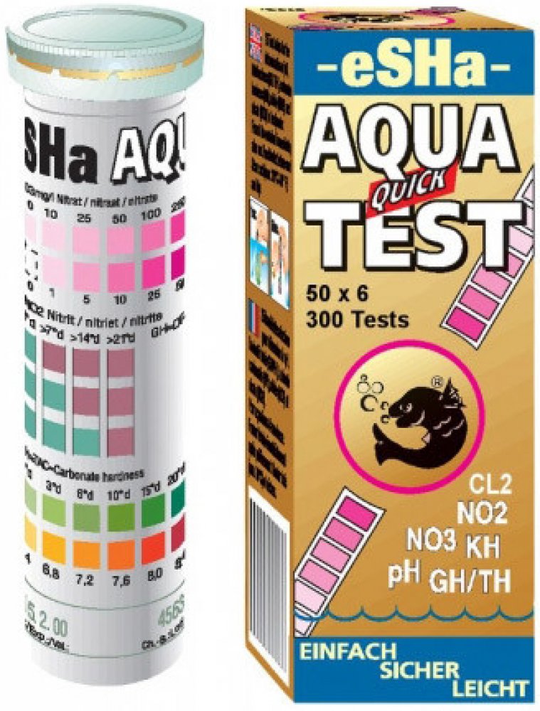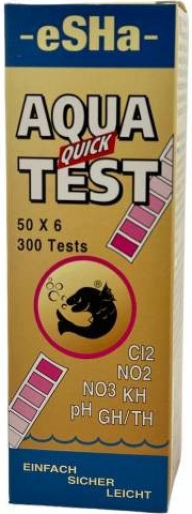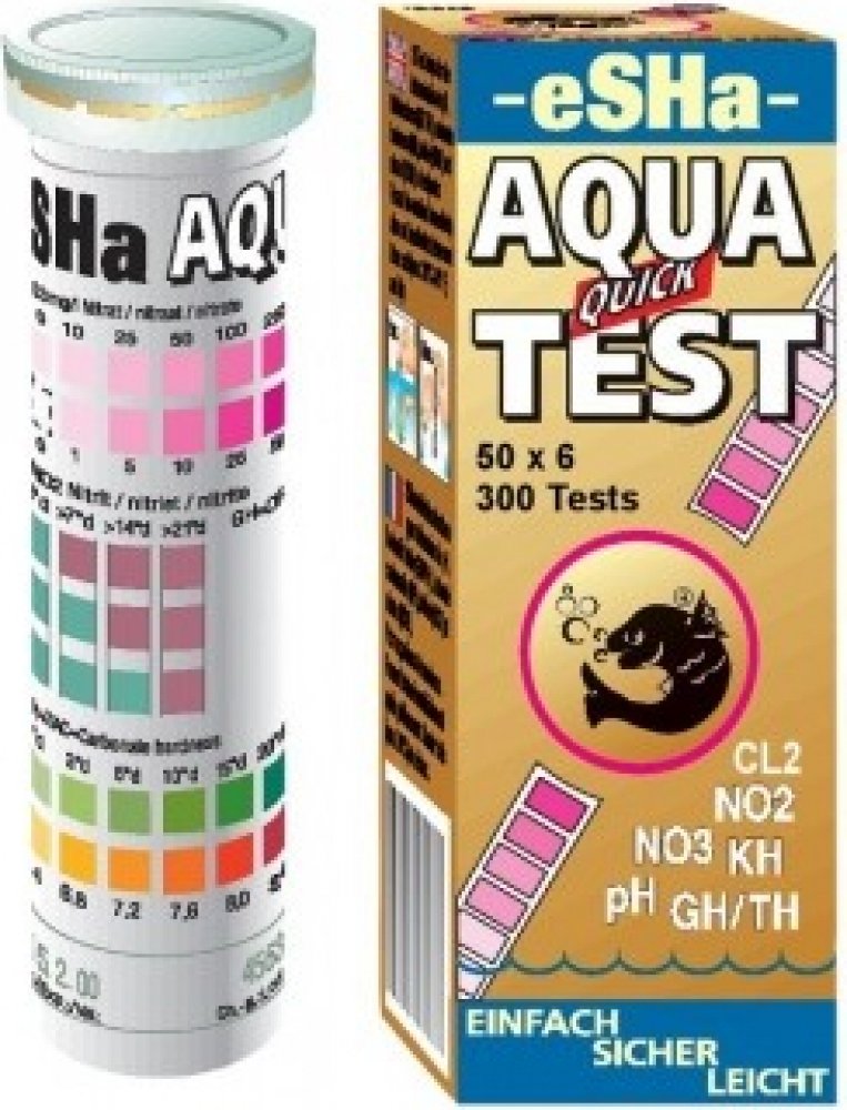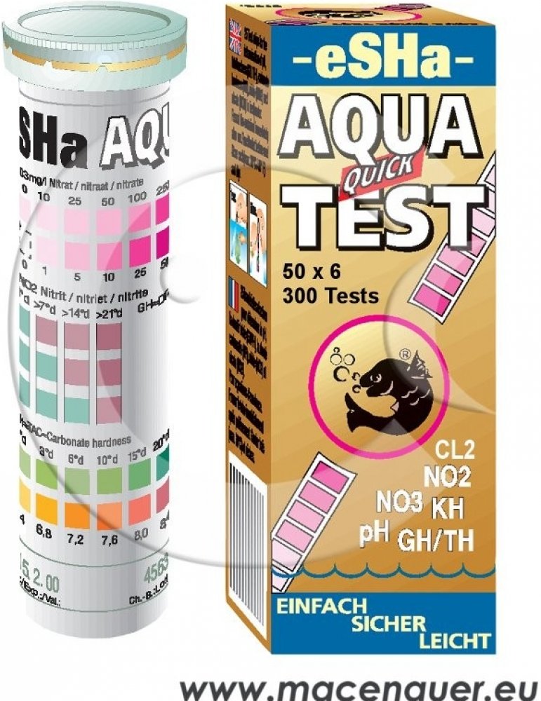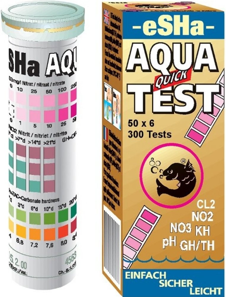 Se soupravou eSHa Aqua-Quick-Test můžete jedním rázem změřit hodnoty, které jsou kritické pro dobrou kvalitu vody: pH (kyselost), KH (karbonátová tvrdost), GH (celková tvrdost), NO2 (obsah dusitanů), NO3 (obsah dusičnanů) a Cl2 (obsah chlóru).