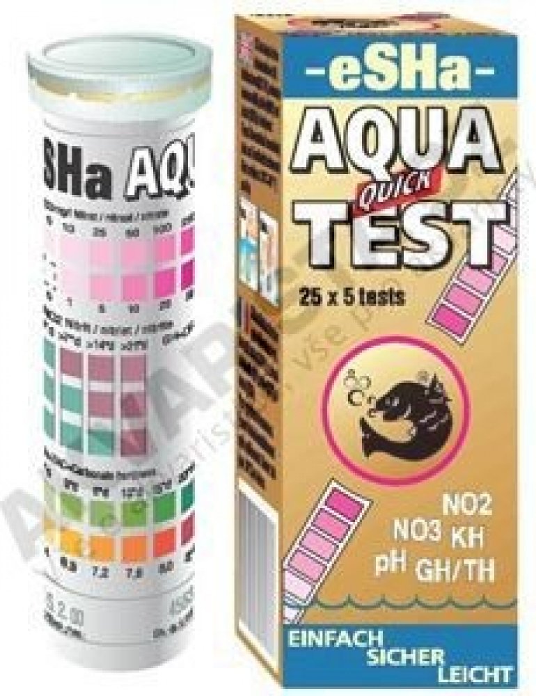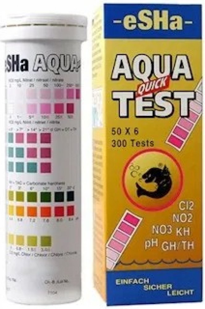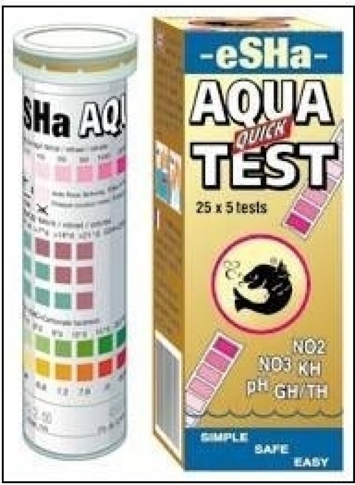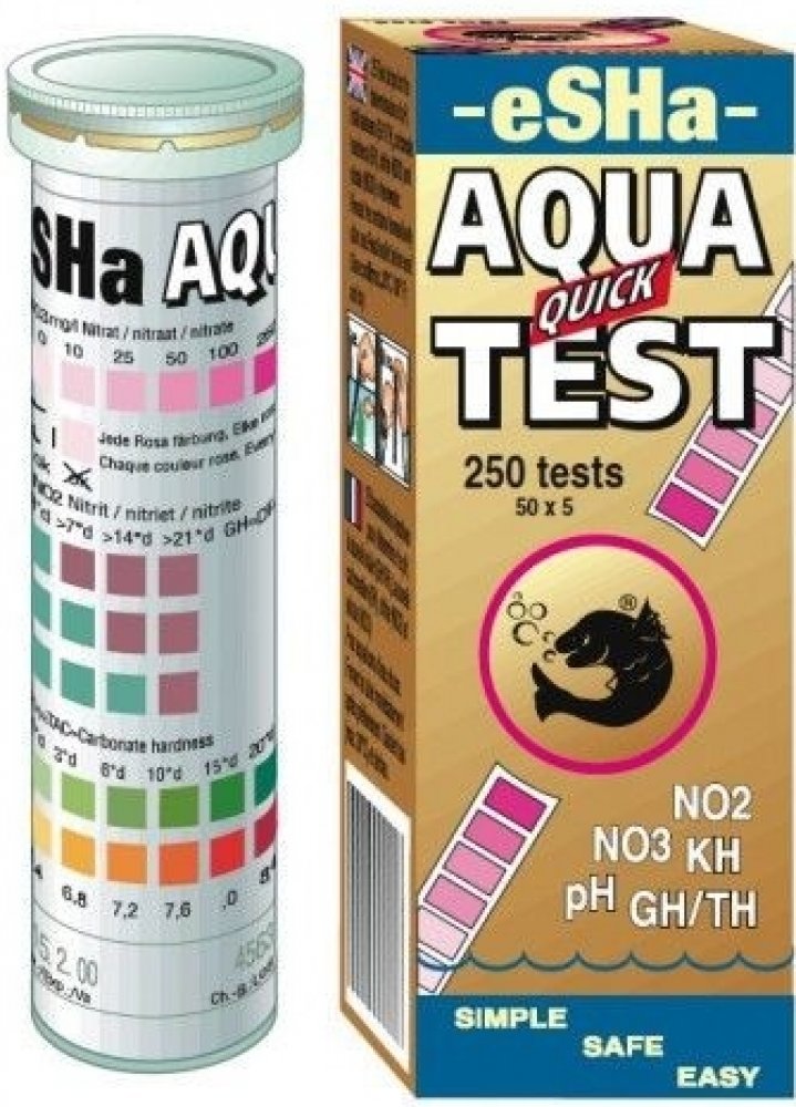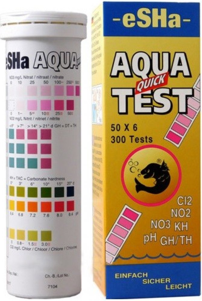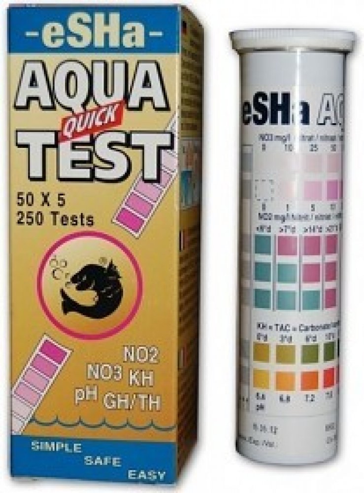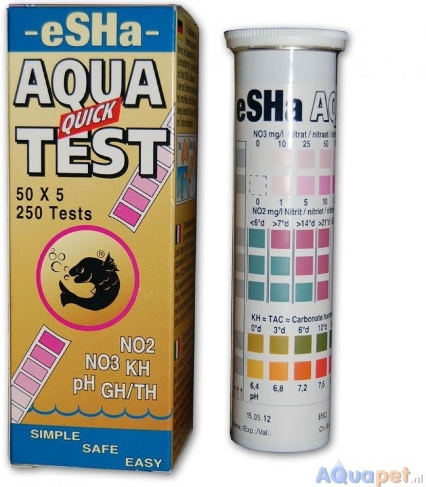 Se soupravou eSHa Aqua-Quick-Test můžete jedním rázem změřit hodnoty, které jsou kritické pro dobrou kvalitu vody: pH (kyselost), KH (karbonátová tvrdost), GH (celková tvrdost), NO2 (obsah dusitanů), NO3 (obsah dusičnanů) a Cl2 (obsah chlóru).