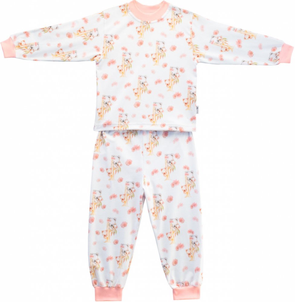 Bavlněné dětské pyžamo s potiskem Koala. Bavlna je v kvalitě GOTS - BIO organická bavlna. Samozřejmostí je kvalitní digitální potisk. Pružný úplet okolo krku, rukávů a kotníků díky kterému se pyžamo pohodlně nosí a přitom nepadá ani netlačí.