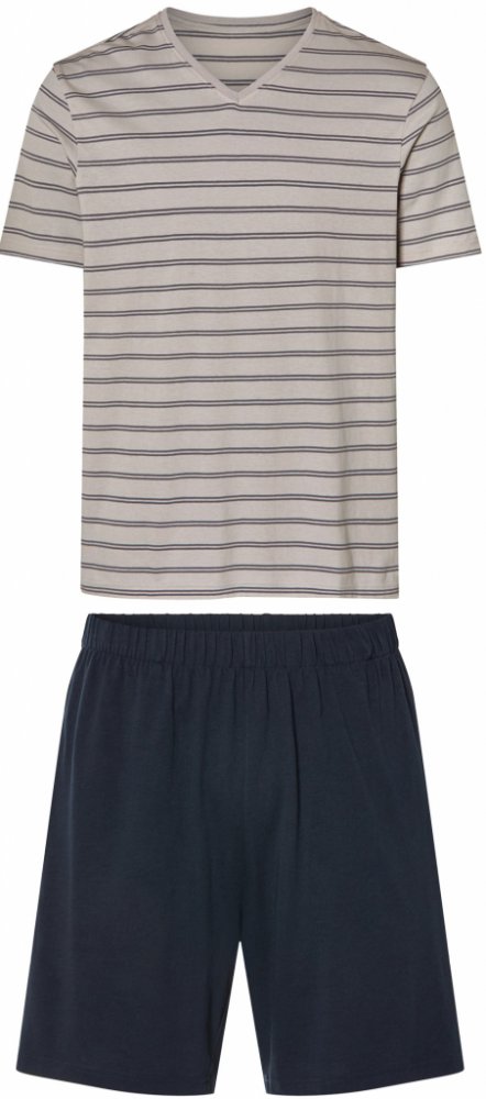 esmara ® Pánské pyžamo Vlastnosti Podporujeme udržitelné pěstování bavlny v Africe Béžová: Obsahuje bavlnu Vyrobeno z recyklovaného materiálu ecoprint - 100 % ekologický tisk textilu Triko s kulatým výstřihem; kraťasy s elastickým pasem a kapsami Šedá pruhovaná / navy modrá: Příjemné nošení díky čisté bavlně Triko s výstřihem do V, kraťasy s elastickým pasem a kapsami Charakteristika produktu tabl...