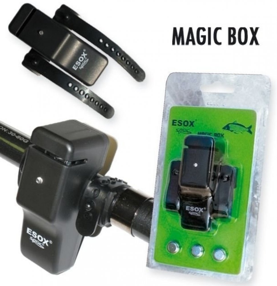 Popis produktu:Esox Magic Box se upíná na prut dvěma gumovými svorkami. Na spodní straně má spínač, který se automaticky zapíná při upnutí na prut. Po sejmutí z prutu se signalizátor automaticky vypne. Dioda modré barvy zasvítí i při jemném potažení vlasce a signalizátor automaticky vydá zvuk. Pootočením kličky navijaku vlasec automaticky vypadne z drážky signalizátoru, což umožňuje pohodlné zdolávání ryby. Je vhodný především při lovu candátů, ale i jiných ryb. Dodává se s třemi bateriemi L44, které jsou součástí balení.