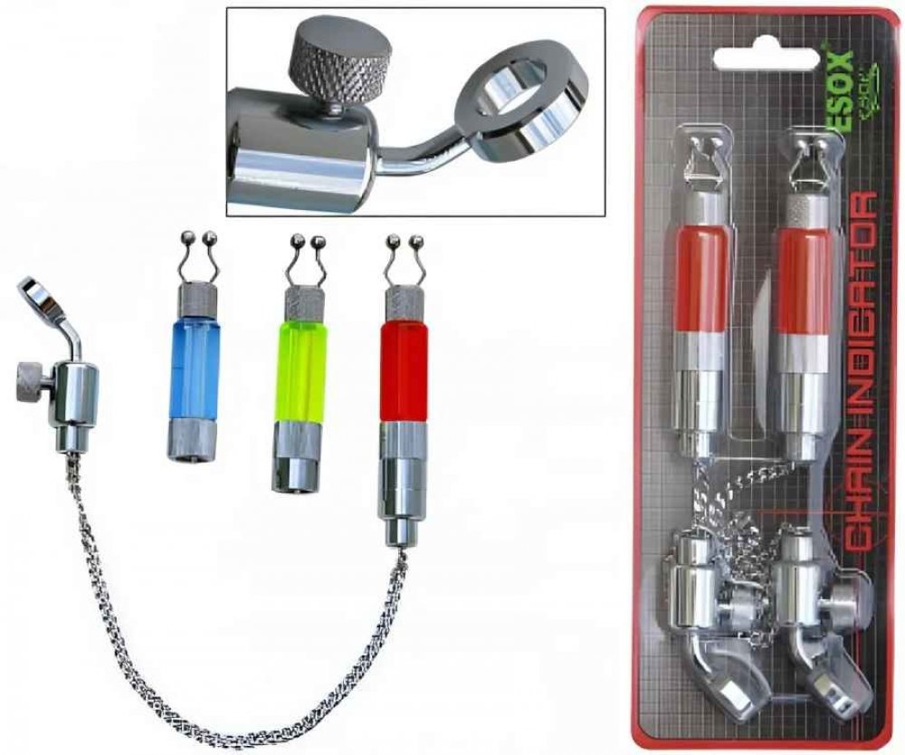 ESOX Swinger řetízkový CHAIN Indicator různé barvy - Esox CHAIN Indicator je špičkový indikátor záběru, tzv. "hanger", vyrobený z kvalitního kovu. Hanger má pevný kovový řetízek a speciální kloub pro připevnění ke stojanu. Indikátor dále má možnost vložení chemického světla a dvě odnímatelné kovové závaží, což zajišťuje spolehlivou indikaci záběru i při silném větru nebo při lovu na velké vzdáleno...