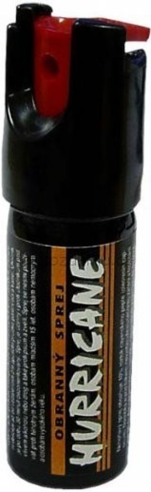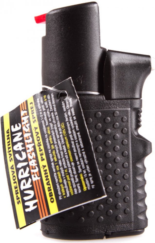 Obranný pepřový sprej malých rozměrů, který se vejde do každé kapsy. Účinnou látkou v toto spreji je OC (oleoresin capsicum), což je výtaček z chilli papriček v 10 % koncentraci. Součástí spreje je gumový návlek se zabudovanou svítilnou s LED diodou, umožňující přesně zacílit i ve tmě. Po vypotřebování obsahu spreje je možné návlek se svítilnou sundat a zasunout do něj nový sprej Hurricane 15ml. Hlavice spreje disponuje otočnou pojistkou proti nechtěnému zmáčknutí spouště. Útočník je po zásahu obličeje oslepen nesnesitelným pálením a slzením očí, má dýchací obtíže a velmi bolestivě pálí i zasažené sliznice a pokožka. Výstřik má formu paprsku takže lépe odolává povětrnostním podmínkám a dosah je kolem 2 m.