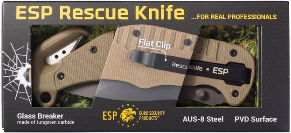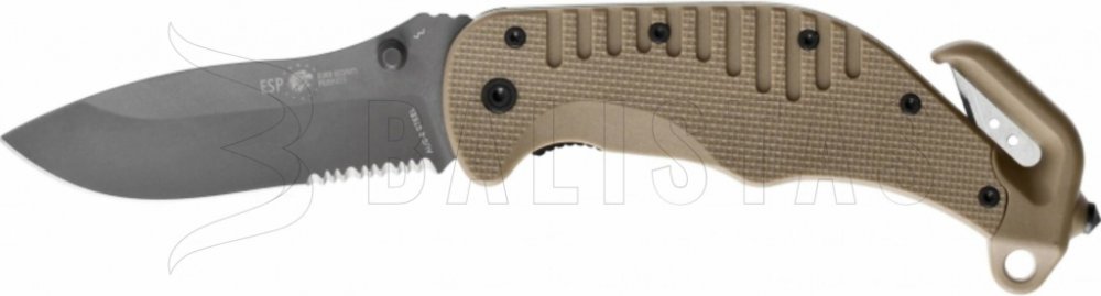 Záchranářský nůž ESP s vroubkovaným ostřím - khaki. Záchranářský nůž ESP spojující v sobě funkce hned několika nástrojů - nože, řezače na textilní pouta a hrotu na rozbíjení skla.