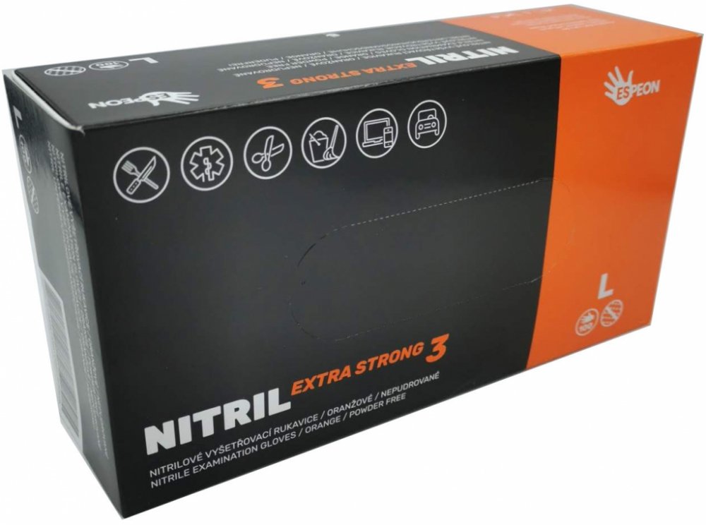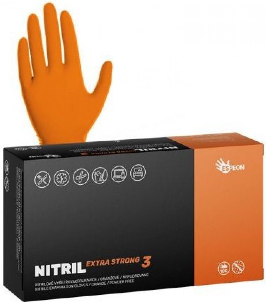 Nitrilové rukavice EXTRA STRONG velikost M - jednorázové ochranné rukavice jsou vyrobeny ze 100% syntetického nitrilu, neobsahují pudr ani latex a nezpůsobují alergické reakce. Rukavice jsou pevné a odolné. Silné nitrilové rukavice pro náročné činnosti Zdrsněné konečky prstů pro lepší úchop a citlivost Velmi příjemně se nosí a nezpůsobují alergické reakce Vnitřní povrchová úprava pro rychlé a snadné nasazení Zvýšená odolnost proti mnoha chemickým látkám Pružnost Nitrilové rukavice můžete natáhnout na více než 5 násobek svojí původní délky. Odolnost proti průniku tekutin Nitrilové rukavice mají velmi dobrou odolnost vůči tekutinám. Odolají: fermež, hydroxid sodný, kyselina chlorovodíková, motorový olej, líh, technický benzín, savo, odmašťovač, stolní olej, ředidlo.Nepoužívejte: aceton, toluen. Odolnost proti protržení Materiál nitrilových rukavic dosahuje až 0,15 mm tloušťky a poskytuje tím odpovídající ochranu při práci. Rukavice mají skvělou odolnost proti propichu. Použití Rukavice nejsou vhodné pro kontakt s velmi horkými předměty. Při používání rukavic zvyšte opatrnost při manipulaci s ostrými předměty. Rukavice navlékejte na suché ruce a po použití proveďte hygienu rukou.