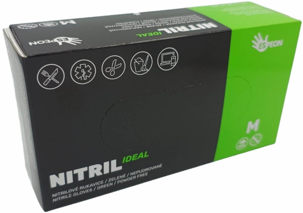 Nitrilové jednorázové ochranné rukavice IDEAL jsou bez pudru, nesterilní. Mají rolovaný okraj, který zachytí možné tekoucí kapky. Rukavice IDEAL se velmi příjemně nosí a nezpůsobují alergické reakce. Mají vynikající úchopovou citlivost, zdrsněné konečky prstů a jsou velmi pevné. Odolají mnoha chemikáliím a rozpouštědlům. Odolají min. 60 min.: epoxydová pryskyřice, fermež, hydroxid sodný, isopropanol, kyselina chlorovodíková, líh, motorový olej, nafta, odmašťovač, perchlorethylen, savo, supermafrasol, stolní olej, ředidlo 6006, technický benzín. Neodolají ani 15 min.: aceton, toluen, ředidlo 6000. Normy: EN 420, EN 455, Cat.III, certifikát do potravinářství. Síla materiálu až 0,09 mm. Délka 24 cm. AQL 1,5.Velikosti: XS, S, M a L. Barva zelená. Balení 100 kusů. Cena uvedena za balení.Doporučené použitíPotravinářský průmysl, laboratoř (např. výroba léčiv, příprava léčiv, výzkum), kosmetický průmysl, kadeřnické salóny, domácí práce, zdravotní péče a auto-moto.Pokyny k použitíNasazují se na suché a čisté ruce. Manžetu umístěte přes oděv, abyste předešli proniknutí kapaliny. Rukavice jsou určeny pouze pro jednorázové použití. Při sundávání rukavic se nedotýkejte jejich vnější strany, přehněte konec manžety a stáhněte je otočením naruby.Pokyny ke skladováníRukavice skladujte v jejich originálním obalu, chraňte před přímým sluncem, v dostatečné vzdálenosti od zdrojů tepla.