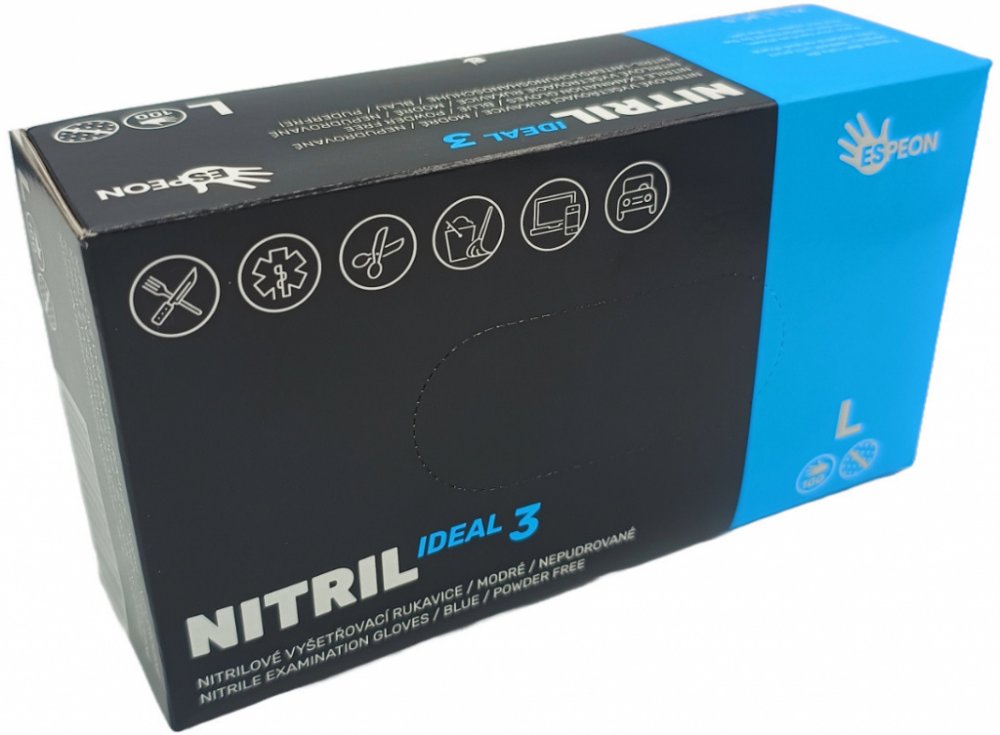 Nitrilové jednorázové ochranné rukavice IDEAL3 jsou bez pudru, nesterilní. Mají rolovaný okraj, který zachytí možné tekoucí kapky. Rukavice IDEAL3 se velmi příjemně nosí a nezpůsobují alergické reakce. Mají vynikající úchopovou citlivost a jsou pružné. Odolají mnoha chemikáliím a rozpouštědlům. Normy: EN 420, EN 455, Cat.I, certifikát do potravinářství. Délka 22 - 23 cm. AQL 1.5.Velikosti: S, M, L a XL. Barva modrá. Balení 100 kusů. Cena uvedena za balení.Doporučené použitíPotravinářský průmysl, laboratoř (např. výroba léčiv, příprava léčiv, výzkum), kosmetický průmysl, kadeřnické salóny, domácí práce a zdravotní péče.Pokyny k použitíNasazují se na suché a čisté ruce. Manžetu umístěte přes oděv, abyste předešli proniknutí kapaliny. Rukavice jsou určeny pouze pro jednorázové použití. Při sundávání rukavic se nedotýkejte jejich vnější strany, přehněte konec manžety a stáhněte je otočením naruby.Pokyny ke skladováníRukavice skladujte v jejich originálním obalu, chraňte před přímým sluncem, v dostatečné vzdálenosti od zdrojů tepla.