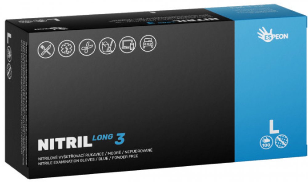 Nitrilové rukavice Espeon Nitril Long3 Powder Free Examination Gloves jsou vyrobeny ze 100% syntetického nitrilu. Rukavice LONG 3 jsou o 6 cm delší než ostatní naše jednorázové rukavice. Rukavice neobsahují pudr ani latex a nezpůsobují alergické reakce. Velmi dobře se nosí a po krátké době se přizpůsobí Vaší ruce. Jsou vhodné pro velmi náročné činnosti, které vyžadují ochranu větší části ruky.